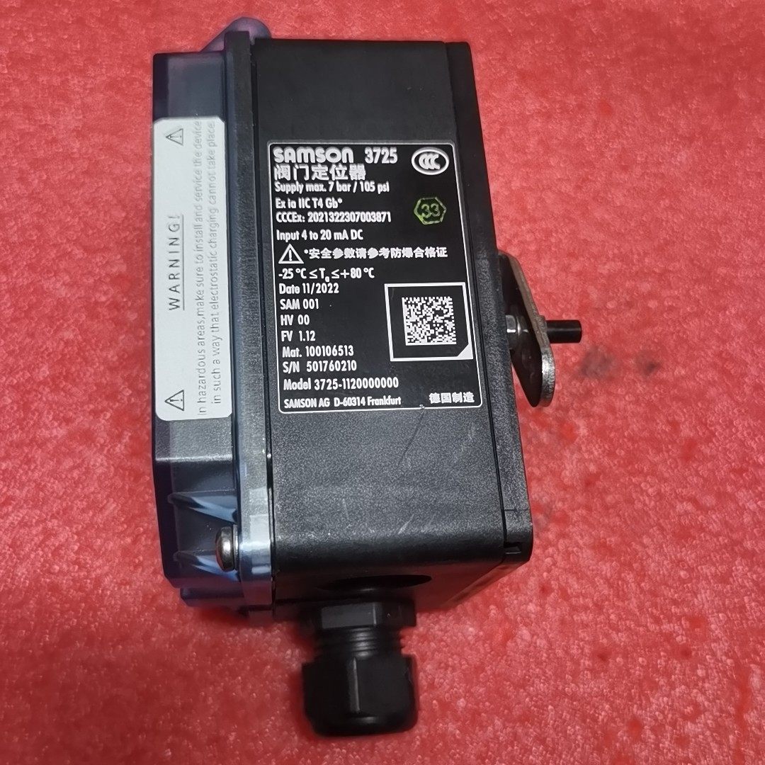 Samson 3725系列阀门定位器是一款高性能的工业自动化控制设备,专为精确控制阀门开度而设计,广泛应用于石油、化工、电力等工业领域的过程控制中。本产品型号为3725-1120000000,版本1.12,输入信号为4到20mA标准电流信号,确保与各类控制系统无缝对接。