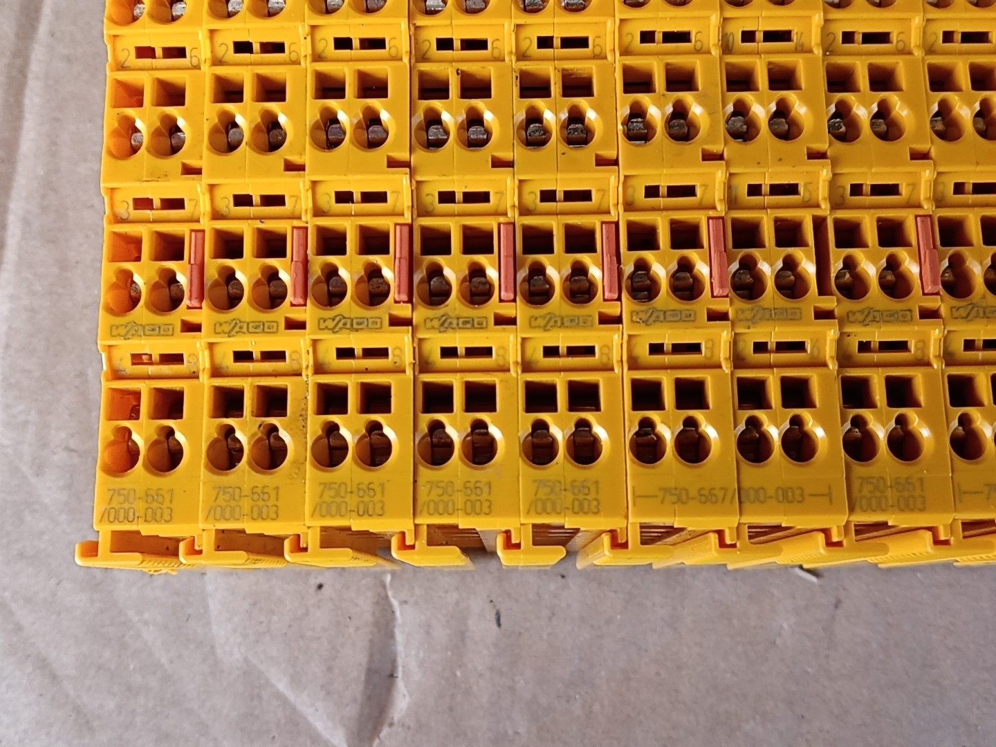 本产品为WAGO(万可)品牌的接线端子台模块,型号涵盖750-661、750-567及750-661/000-003。采用黄色外壳设计,表面分布多组接线孔位与清晰的编号标识,适用于工业电气线路的连接与转接。产品为全新未使用状态,但无原包装,现按二手处理。