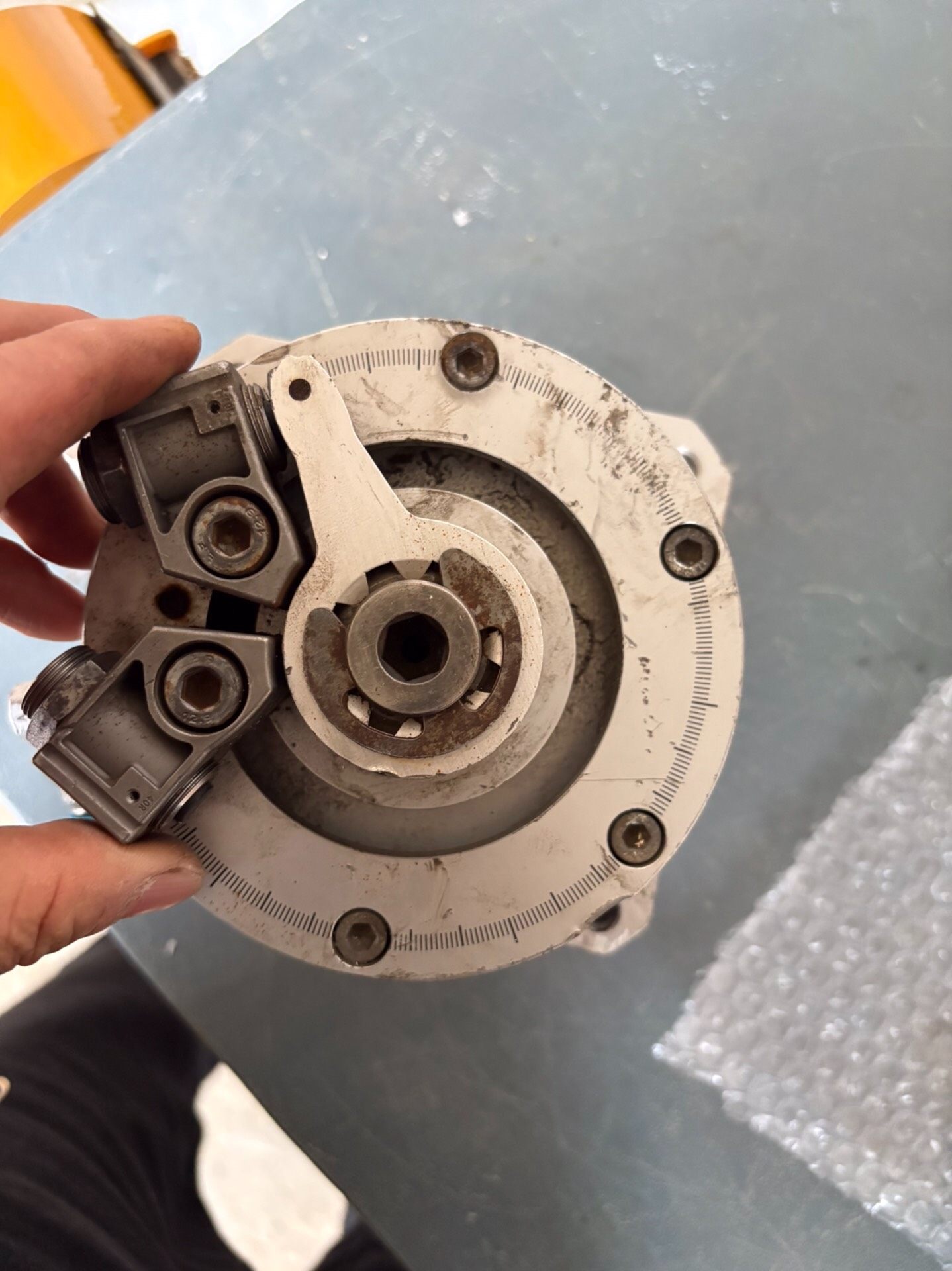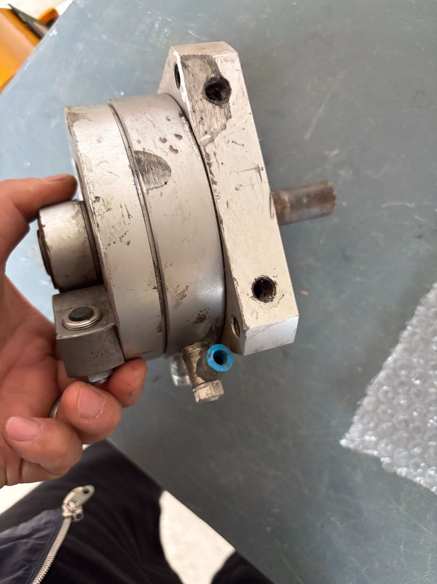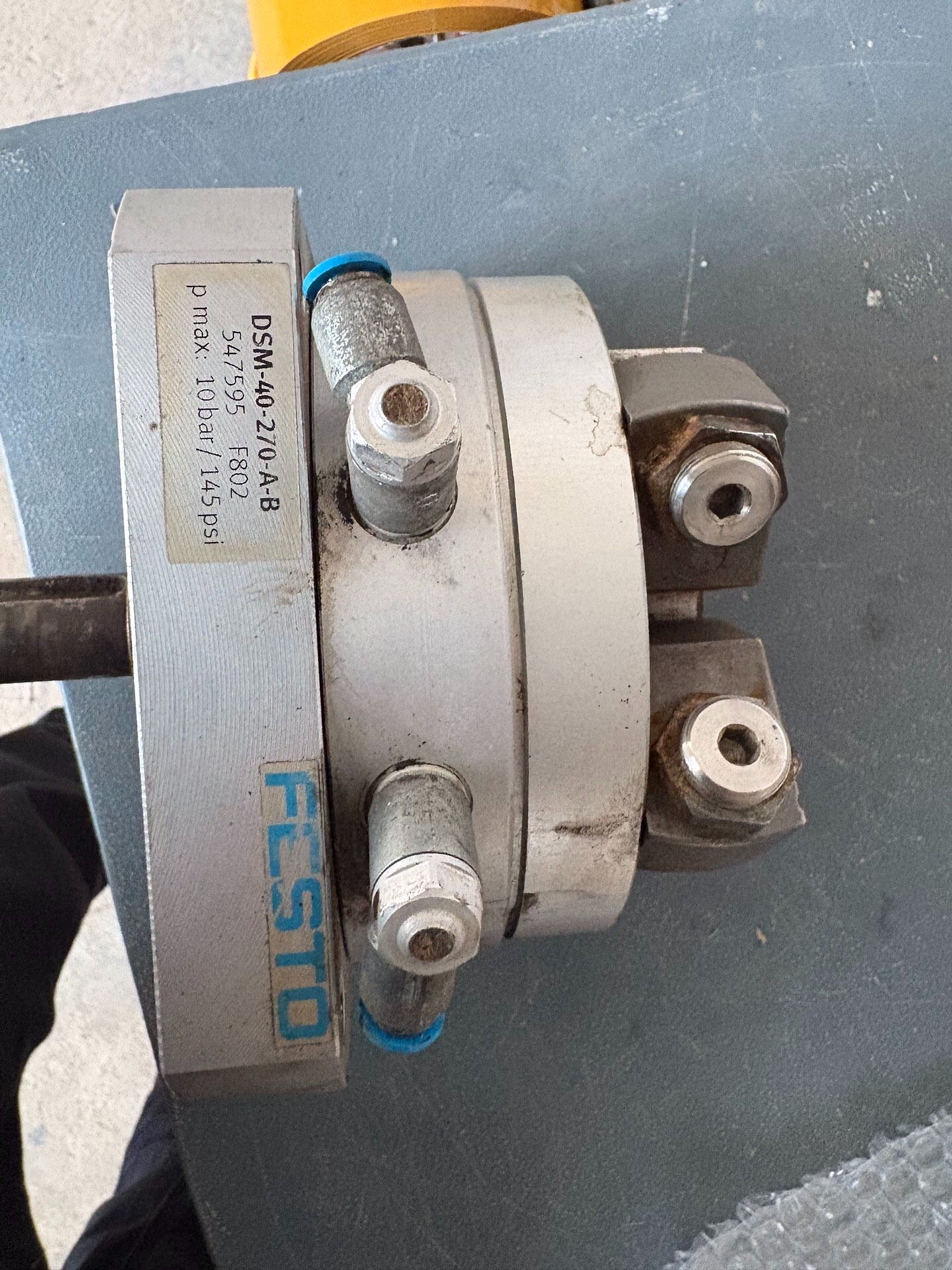本产品为拆机的FESTO摆动气缸,型号为DSM-40-270-A-B,属于气动执行元件中的旋转气缸类别。产品整体为银色金属材质,表面存在一定使用痕迹,成色一般,但核心功能完好,适用于各类工业自动化场景中的旋转运动控制需求。