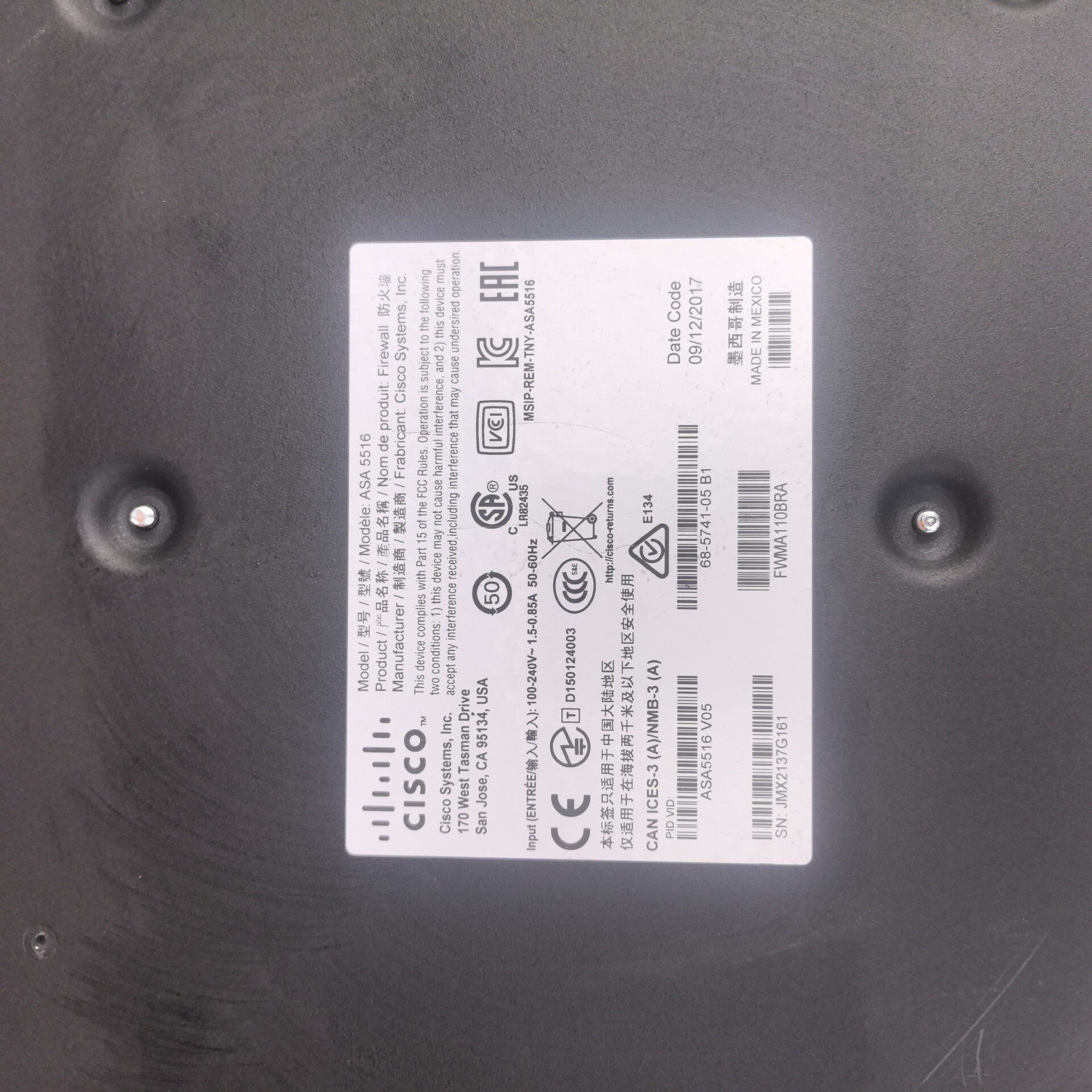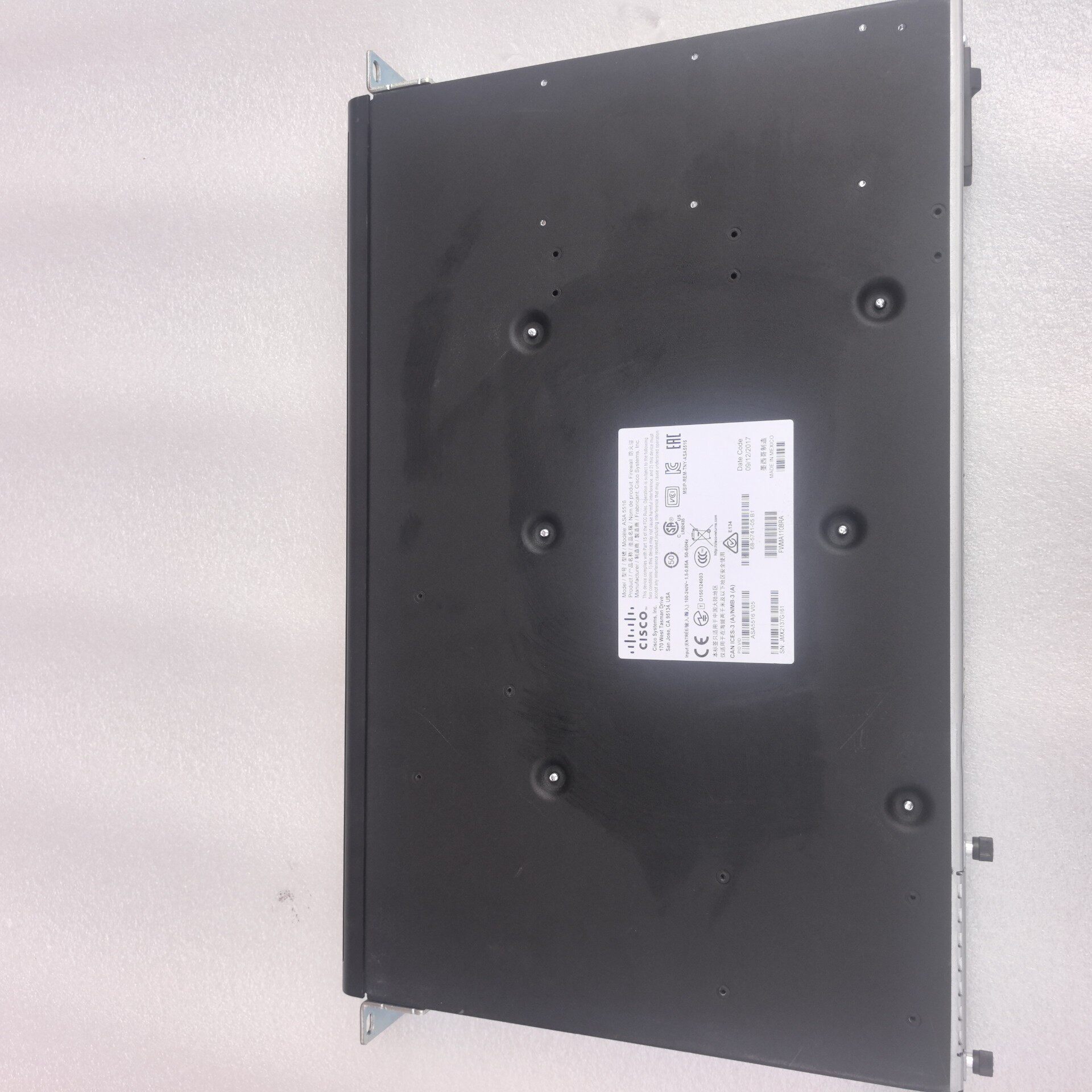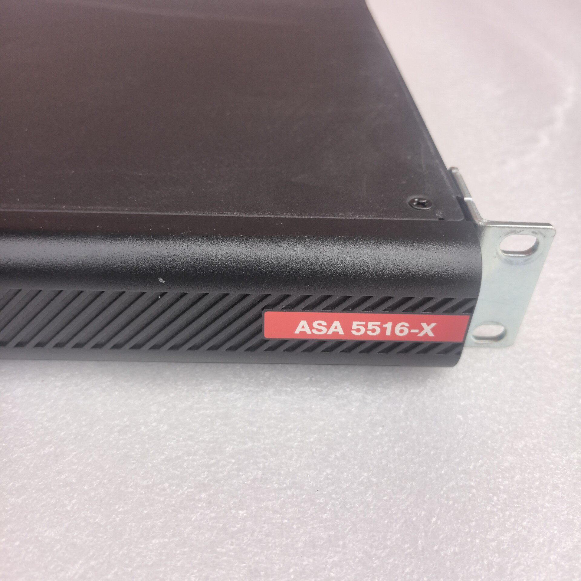 Cisco ASA 5516-X 是一款企业级机架式防火墙,专为中小型企业及分支机构设计,提供可靠的网络安全防护能力。设备采用黑色1U机架式设计,机身印有Cisco品牌标识及型号信息,整体外观简洁耐用,适合机房机柜安装(不带安装耳朵,可适配标准机柜)。