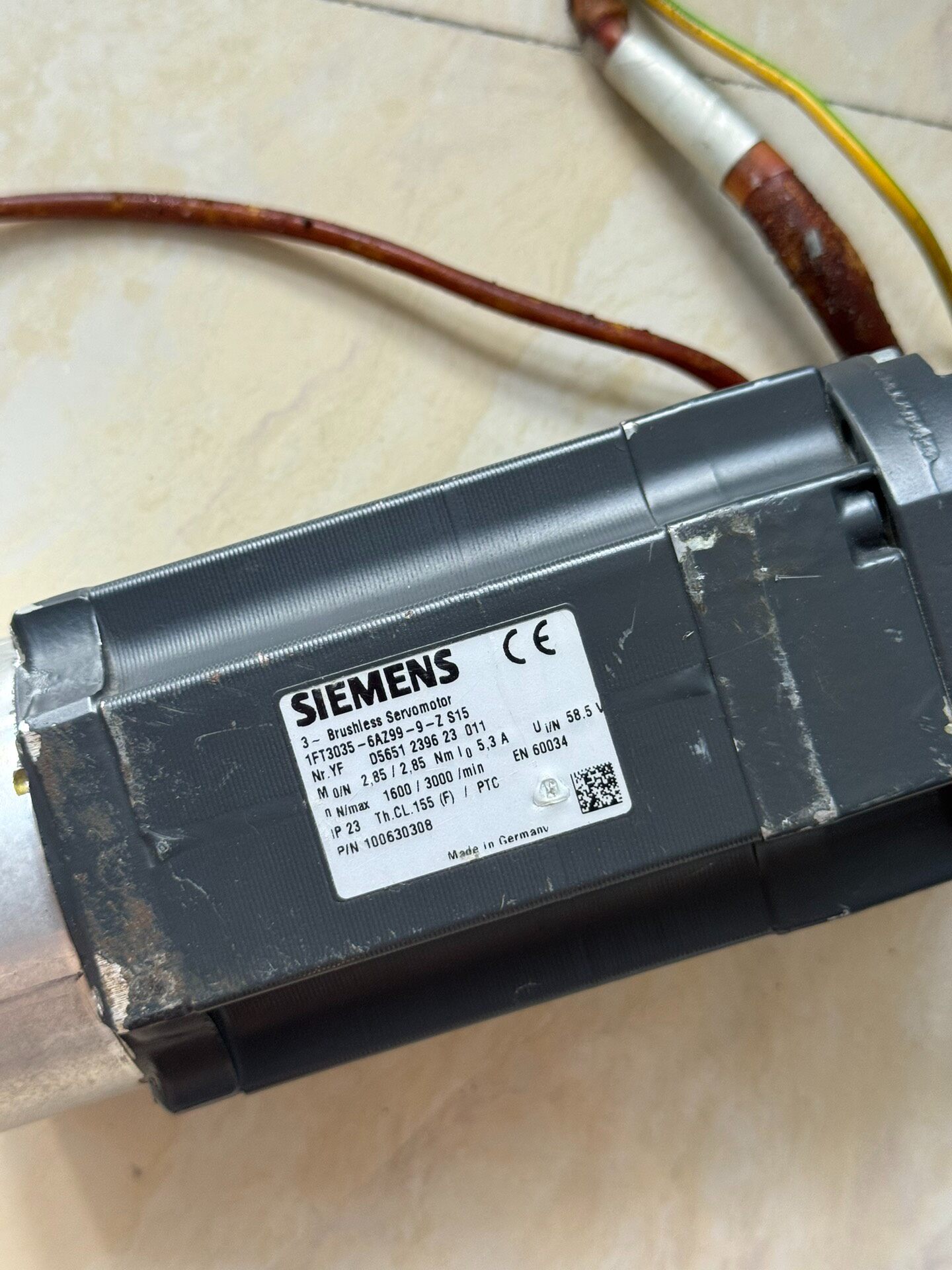 该产品为西门子品牌伺服电机,型号1FT3035-6AZ99-9-Z S 15,属于拆机实物。外壳采用黑色工程塑料与银色金属材质结合,结构坚固耐用,能适应工业环境下的稳定运行。线缆部分虽有轻微老化,但功能经过检测包好,可直接用于设备替换或维修。