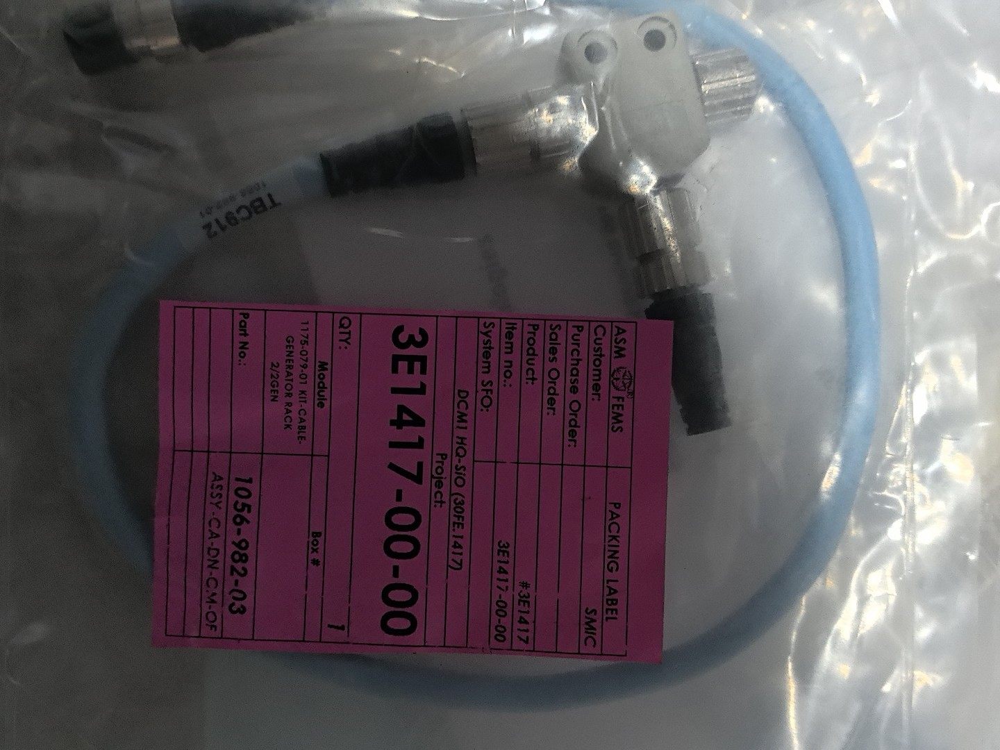 ASM 3E1417-000-000 电缆套件是一款专为工业场景设计的高品质连接组件,主要应用于发电机机架的电缆系统。产品为全新原装,附带粉色包装标签,标签信息完整,包含型号、部件号、数量等关键参数,确保产品的可追溯性和可靠性。
