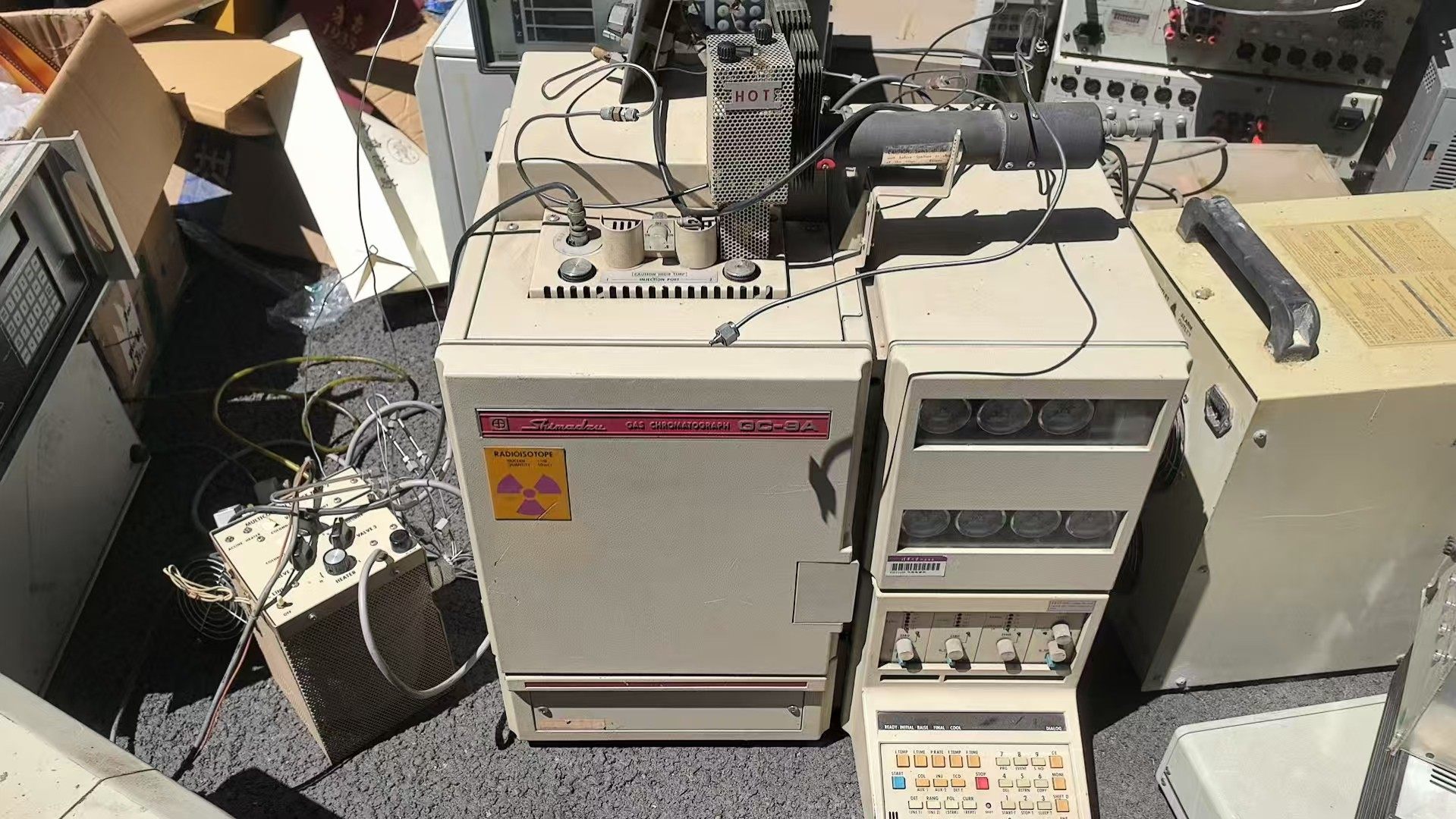 本产品为岛津(Shimadzu)GC-9A型气相色谱仪,设备主体呈米色,正面清晰标注型号及品牌信息,右侧集成多组仪表用于压力等参数显示。机身贴有放射性(RADIOISOTOPE)警告标签,提示设备可能涉及放射性相关部件。整体外观存在使用痕迹,适合作为拆配件来源。