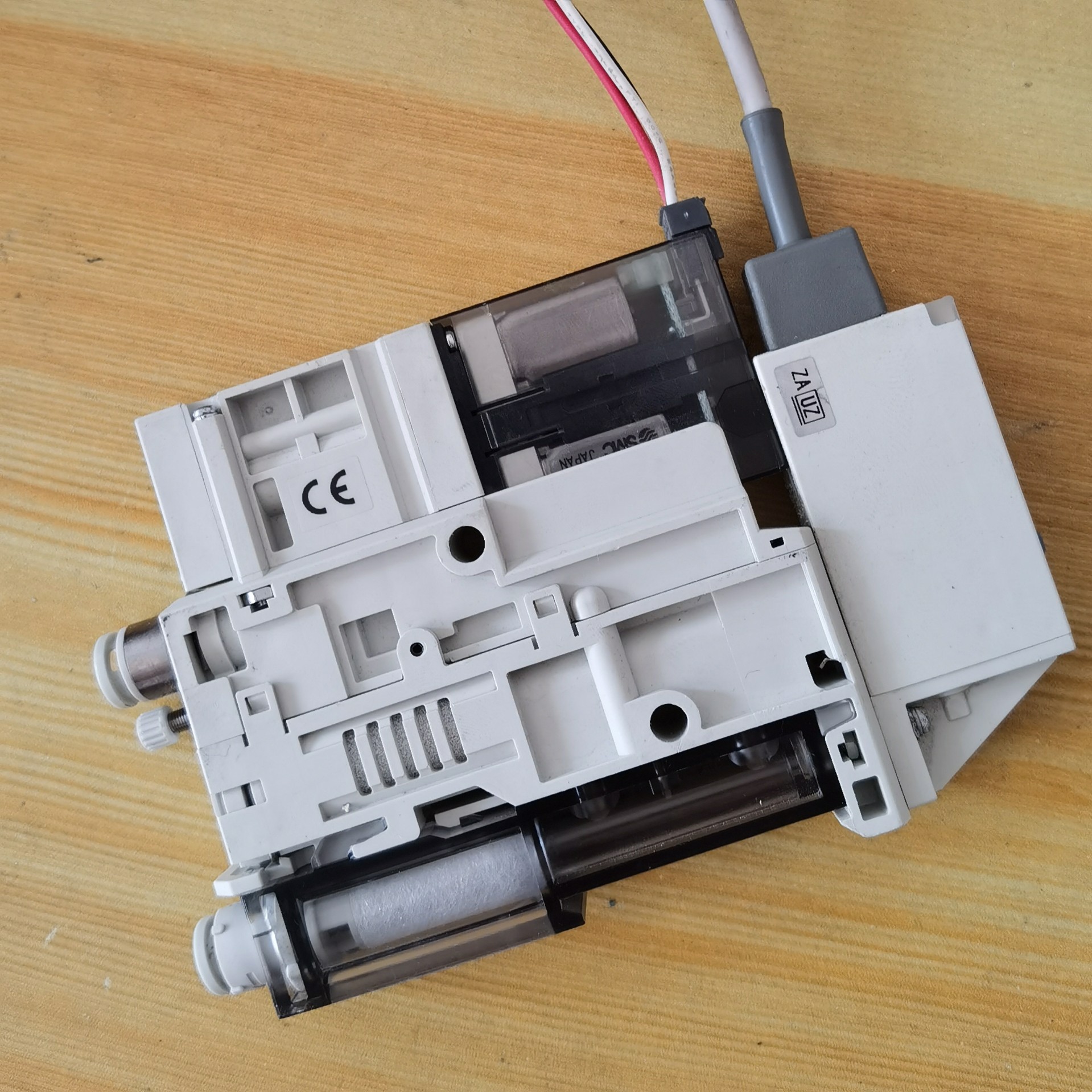 本产品为SMC品牌真空发生器,型号ZK2A10K5AL-05,日本制造。主体采用白色塑料材质,结构紧凑,带有橙色和绿色指示灯按钮,便于观察工作状态,配备金属接口,连接稳定可靠。