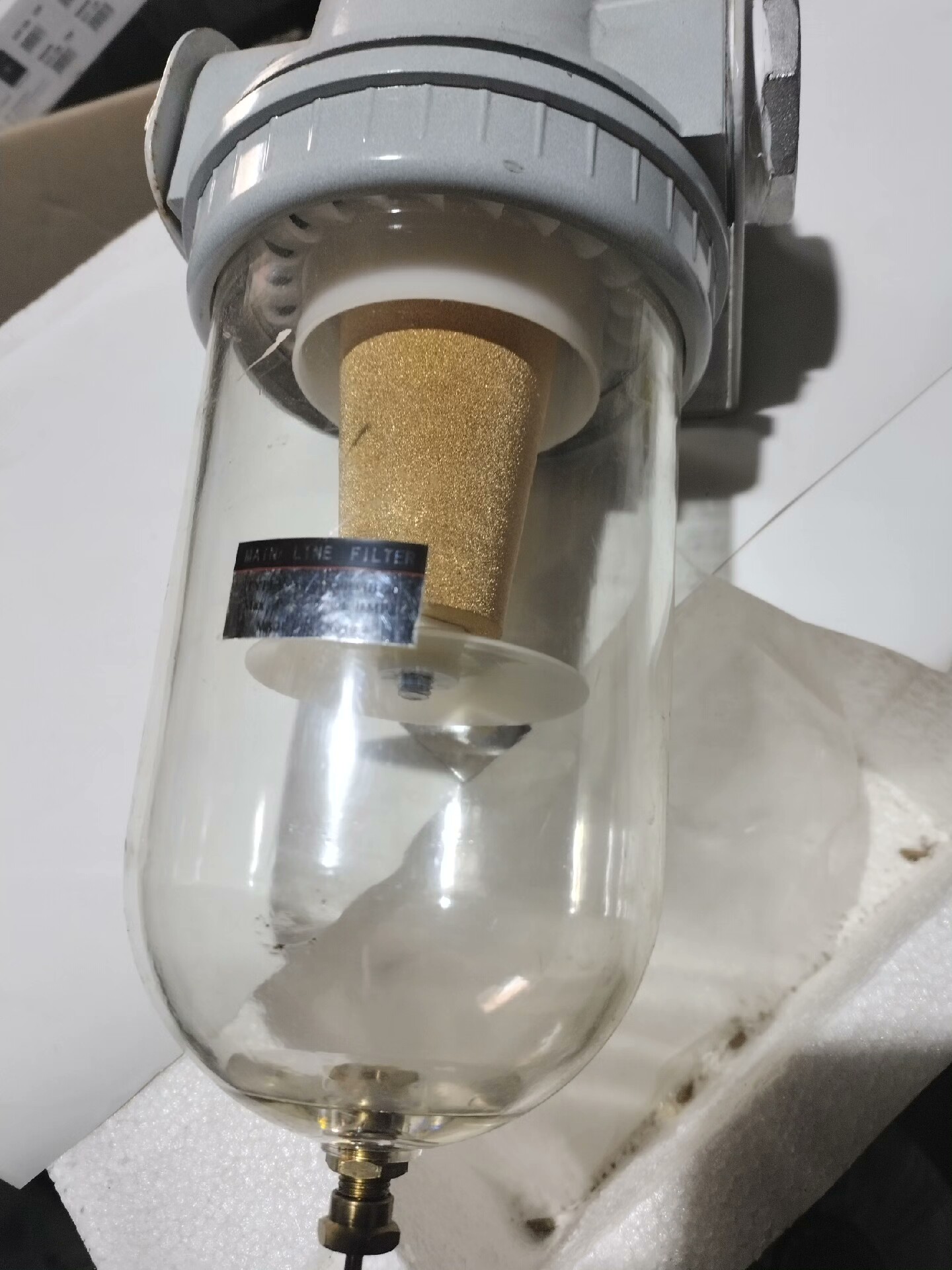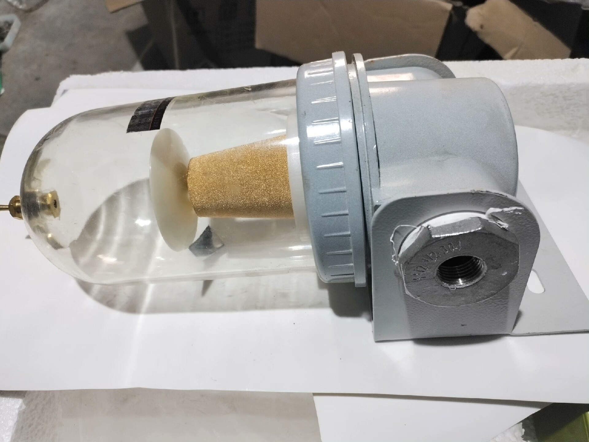 本产品为海克斯康三坐标设备配套的油水分离器,型号AF37B-20,属于全新品。采用灰色顶部设计,搭配透明玻璃罐体,可直观观察内部过滤情况;内置高效金色滤芯,能有效分离压缩空气中的油分和水分,保障气源洁净;底部设有便捷排水阀,便于定期排放积液;配备金属安装支架,安装稳固。