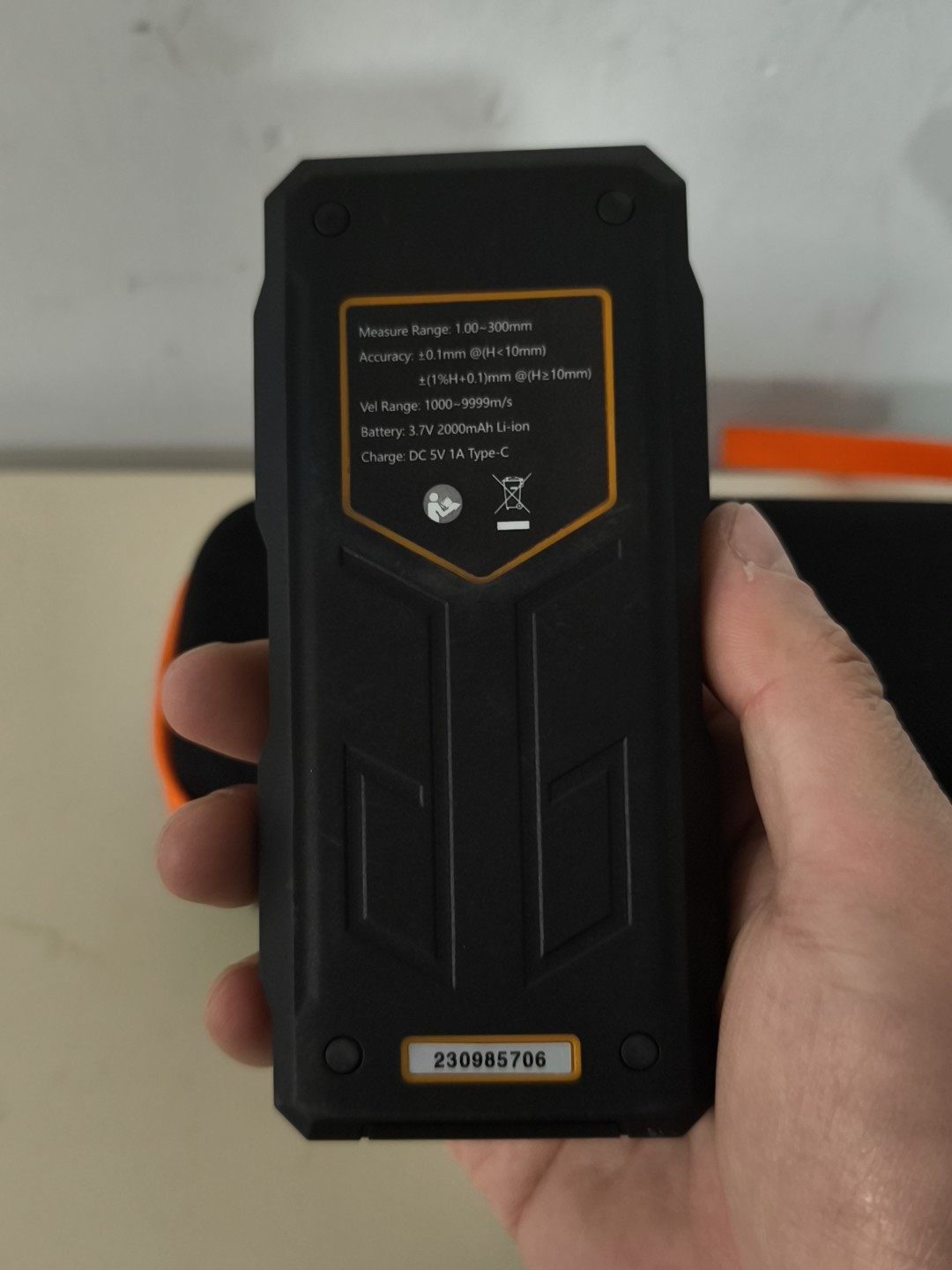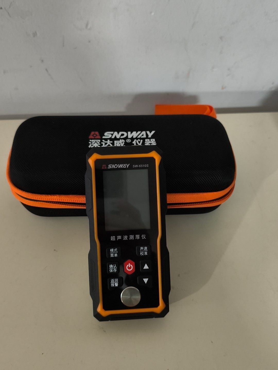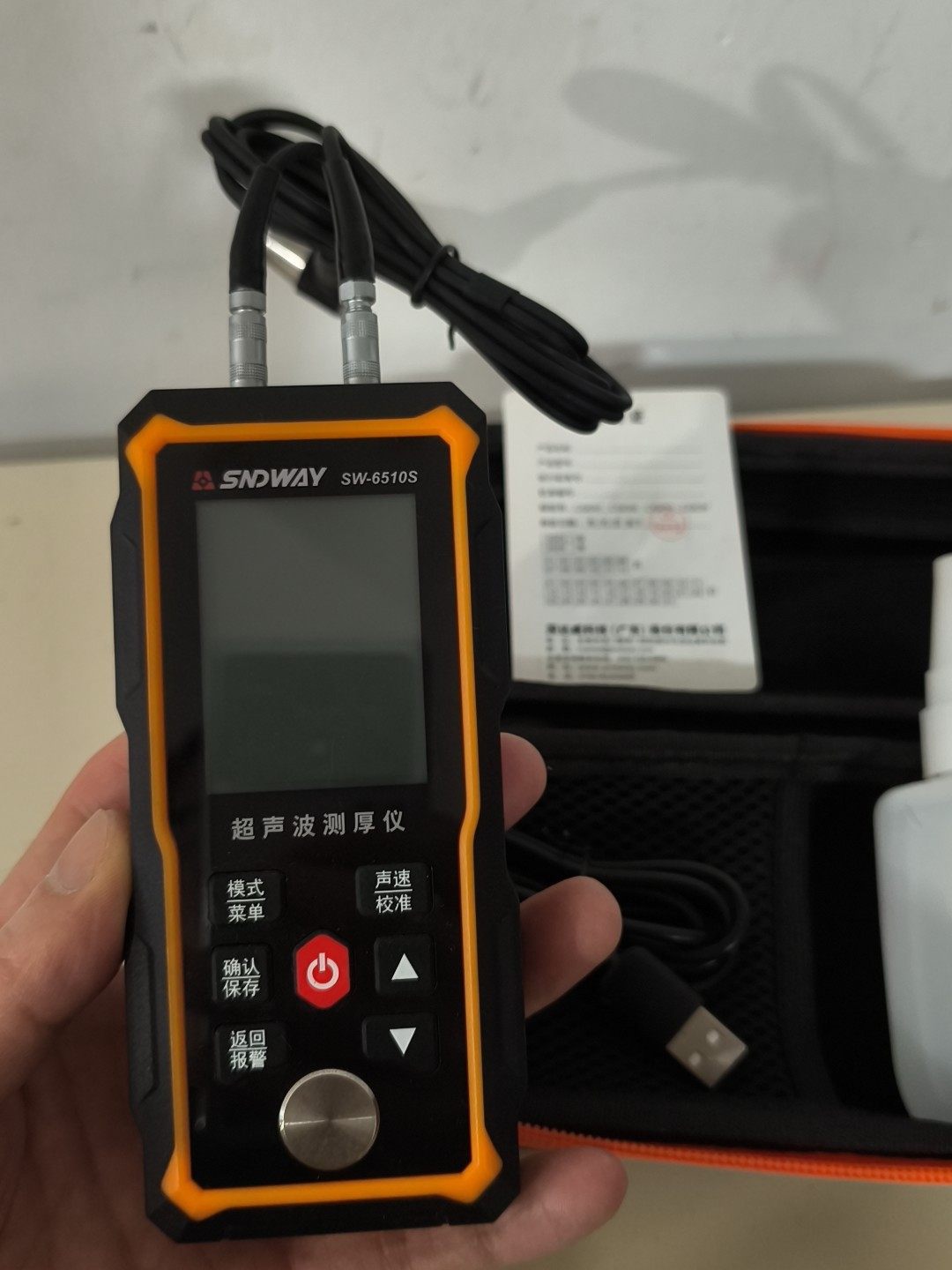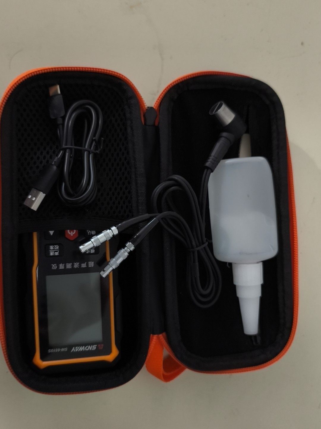 本产品为SWDWAY品牌SW6310型号超声波测厚仪,整体呈黑色与橙色相间设计,手持便捷,配备清晰显示屏及功能按键,操作直观。设备9.9成新,买来几乎未使用,性能完好,附件齐全,包含探头、USB充电线、耦合剂及专用便携收纳包,方便携带与存储。