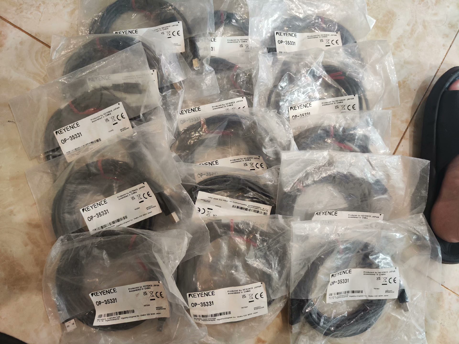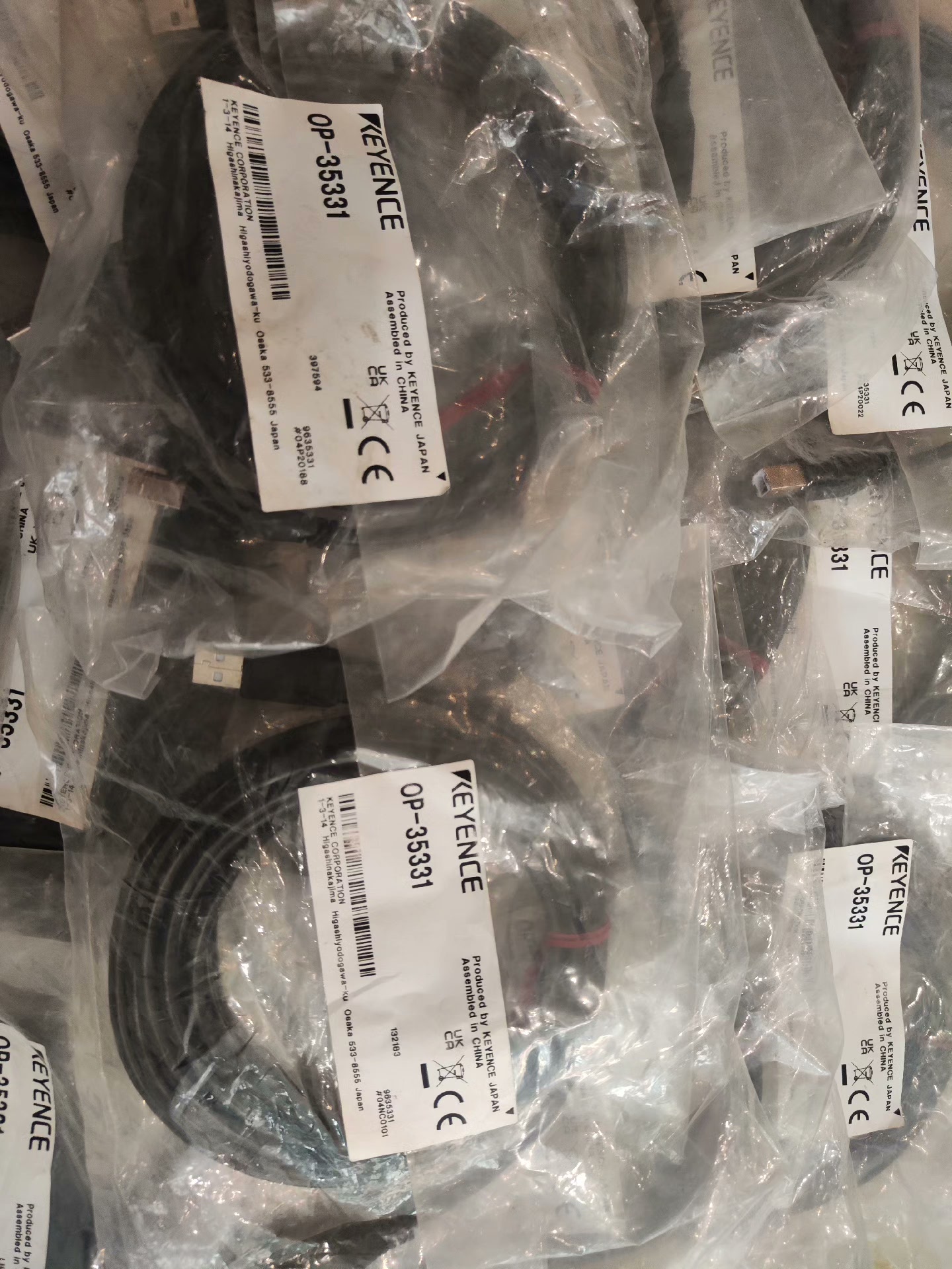 本产品为KEYENCE(基恩士)品牌的OP-35331工业连接线缆,由日本基恩士生产,中国组装,具备CE认证,确保产品符合相关质量标准。线缆整体呈黑色,两端配备连接器,外层采用透明塑料包装保护,方便存储与运输。