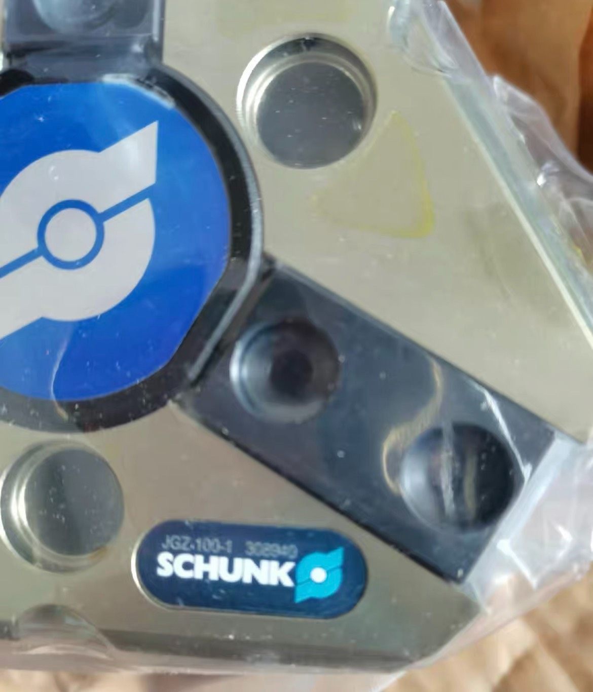 雄克 JGZ 100-1 手指气缸(货号308940)是一款全新原装正品气动执行元件,采用高精度金属材质制造,整体结构紧凑,设计对称多爪布局,中心配备蓝色品牌标识,表面分布多个标准化安装孔,便于集成到各类自动化设备中,主要用于工业生产中的物料抓取、定位与夹持等操作。