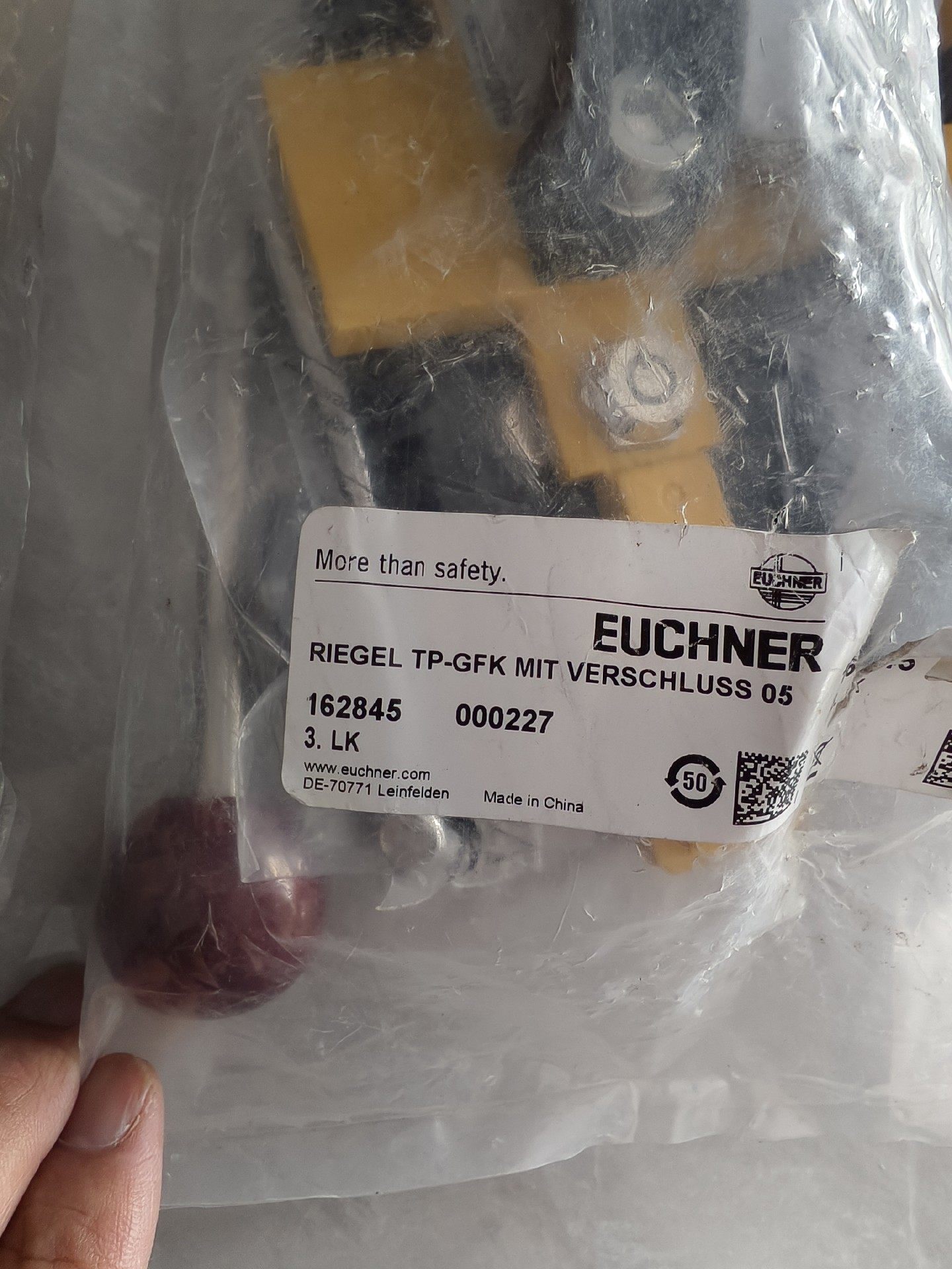 EUCHNER RIEGEL TP-GFK MIT VERSCHLUSS 05 安全门开关(订货号:162845)是一款全新未拆封的工业安全防护产品,采用黄色与黑色的经典安全配色结构,专为机械设备的安全防护设计,主要用于锁定门或防护装置,确保设备运行时操作人员的安全。