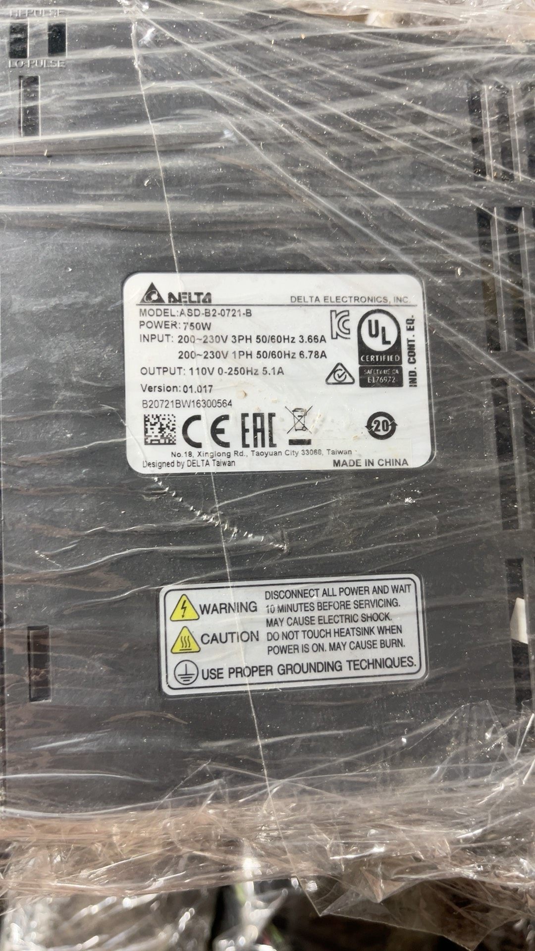 本产品为台达(DELTA)品牌的750W伺服驱动器及配套电机组合,具体型号包括驱动器ASD-B2-0721-B和电机ECMA-C20807RS。产品为拆机现货,实物拍摄,成色良好,外壳采用透明塑料包裹保护,确保运输和存储过程中的安全性。