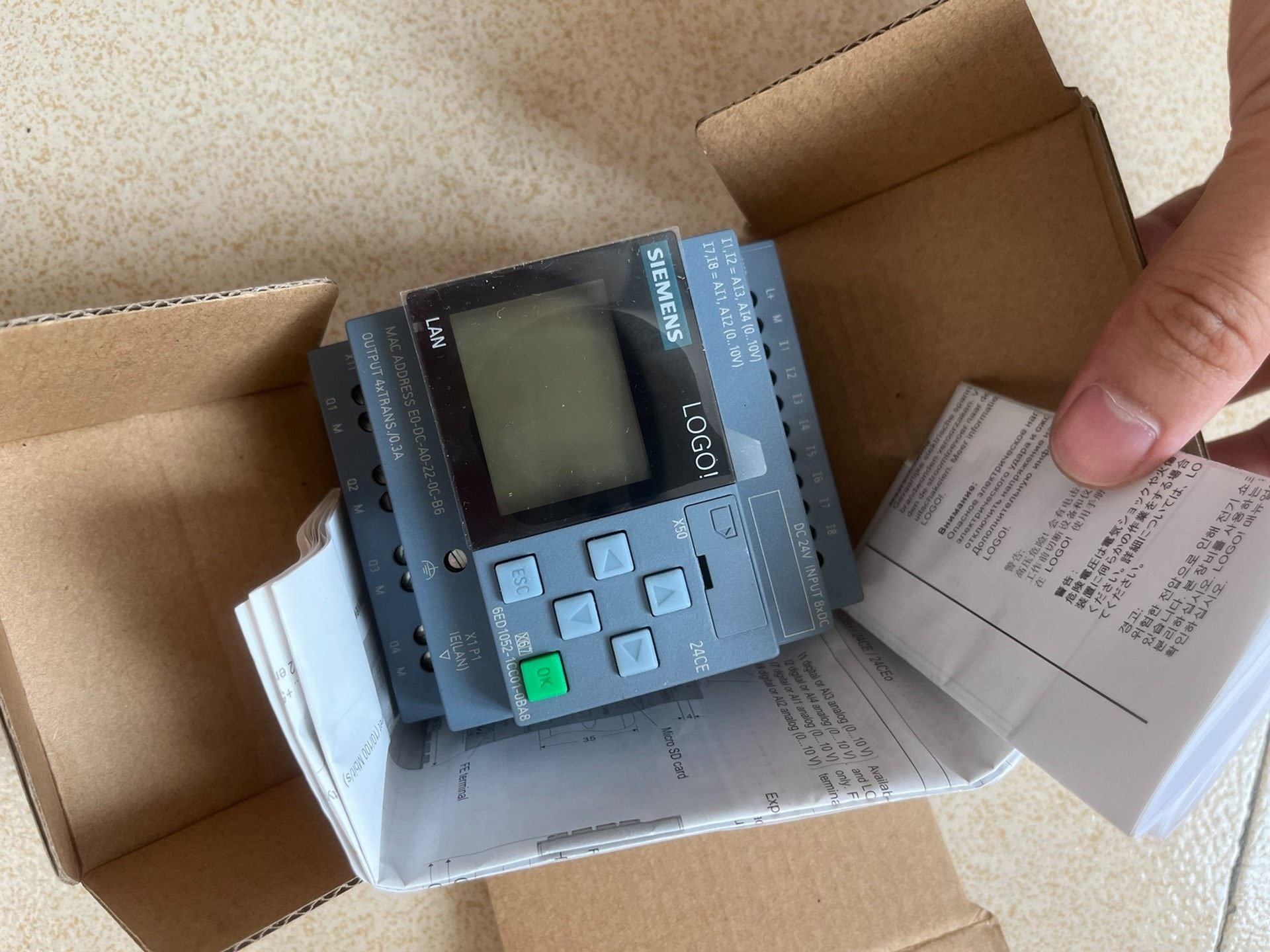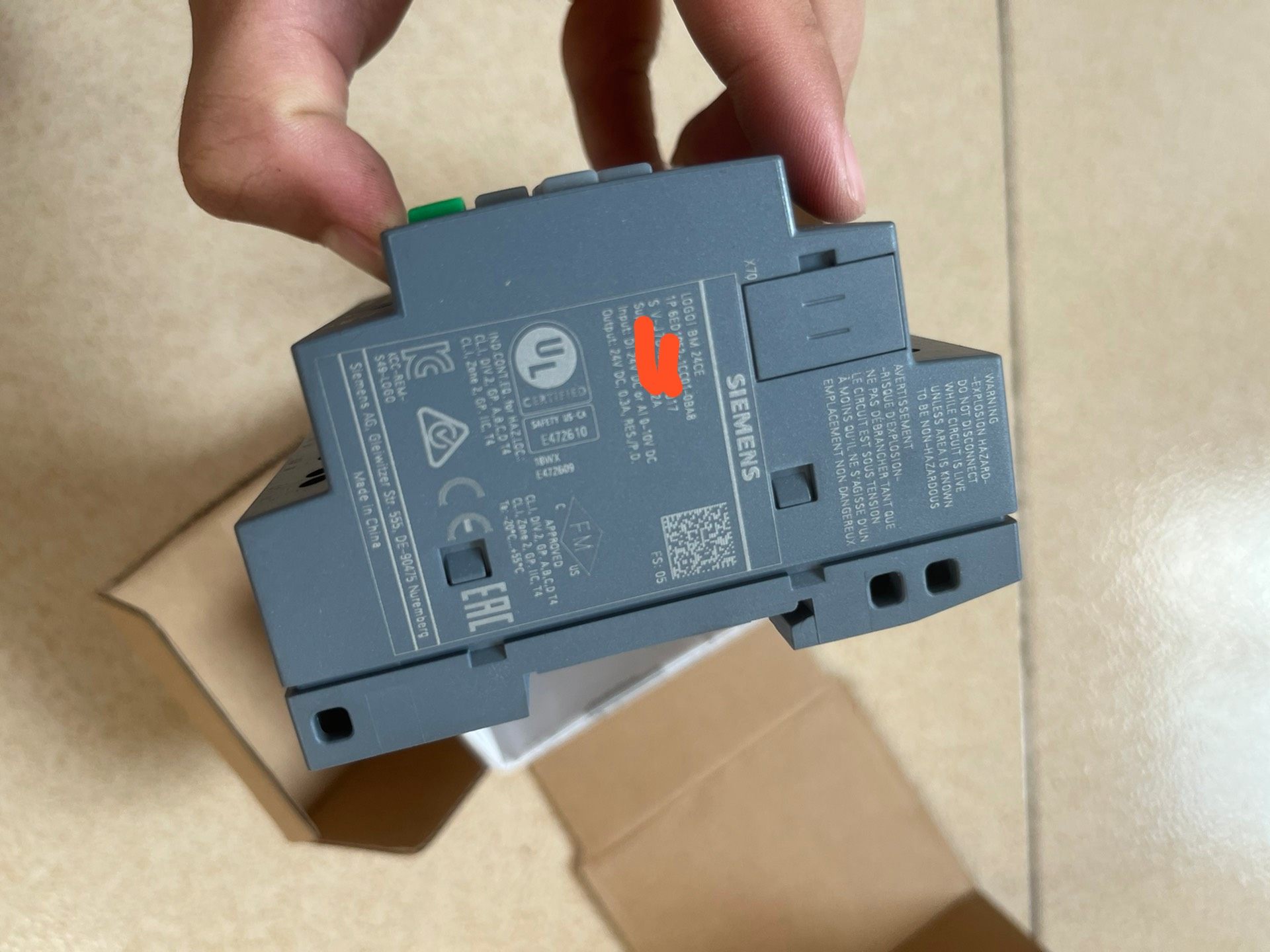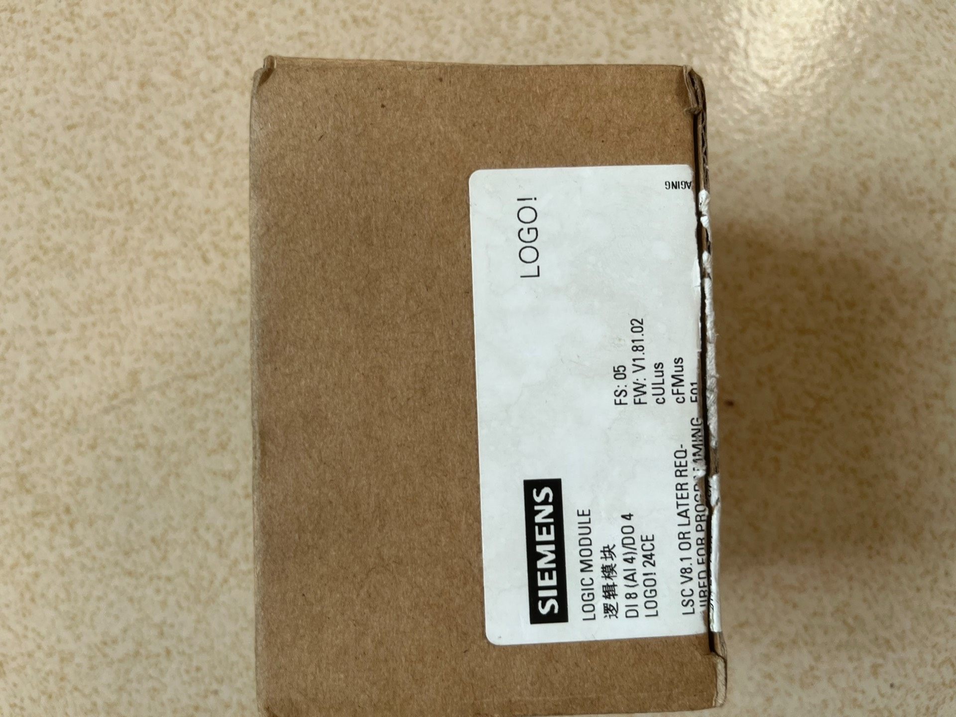 本产品为西门子(Siemens)旗下LOGO!系列PLC模块,型号为6ED1052-1CC01-0BA8,属于全新仅拆封原装正品,包装为棕色纸箱,标签包含CE认证、中国制造标识及详细生产信息,确保产品质量与 authenticity。