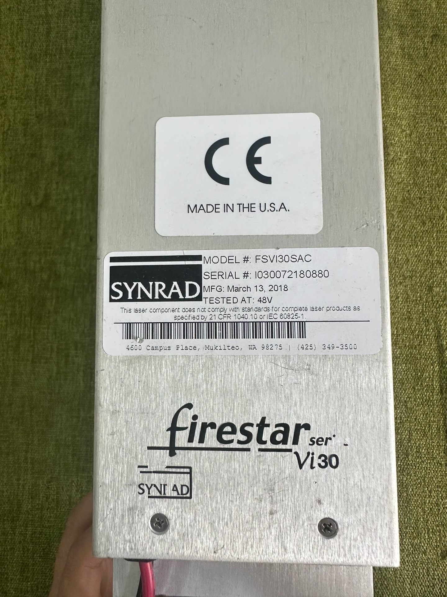本产品为SYNRAD品牌的FSV30SAC型号Vi30系列激光传感器,是一款工业级高功率激光设备。设备为拆机件,2016年3月在美国生产,成色良好,功能经过严格测试确保正常,质量问题提供包退换服务,现货1台,下单当天即可发货。