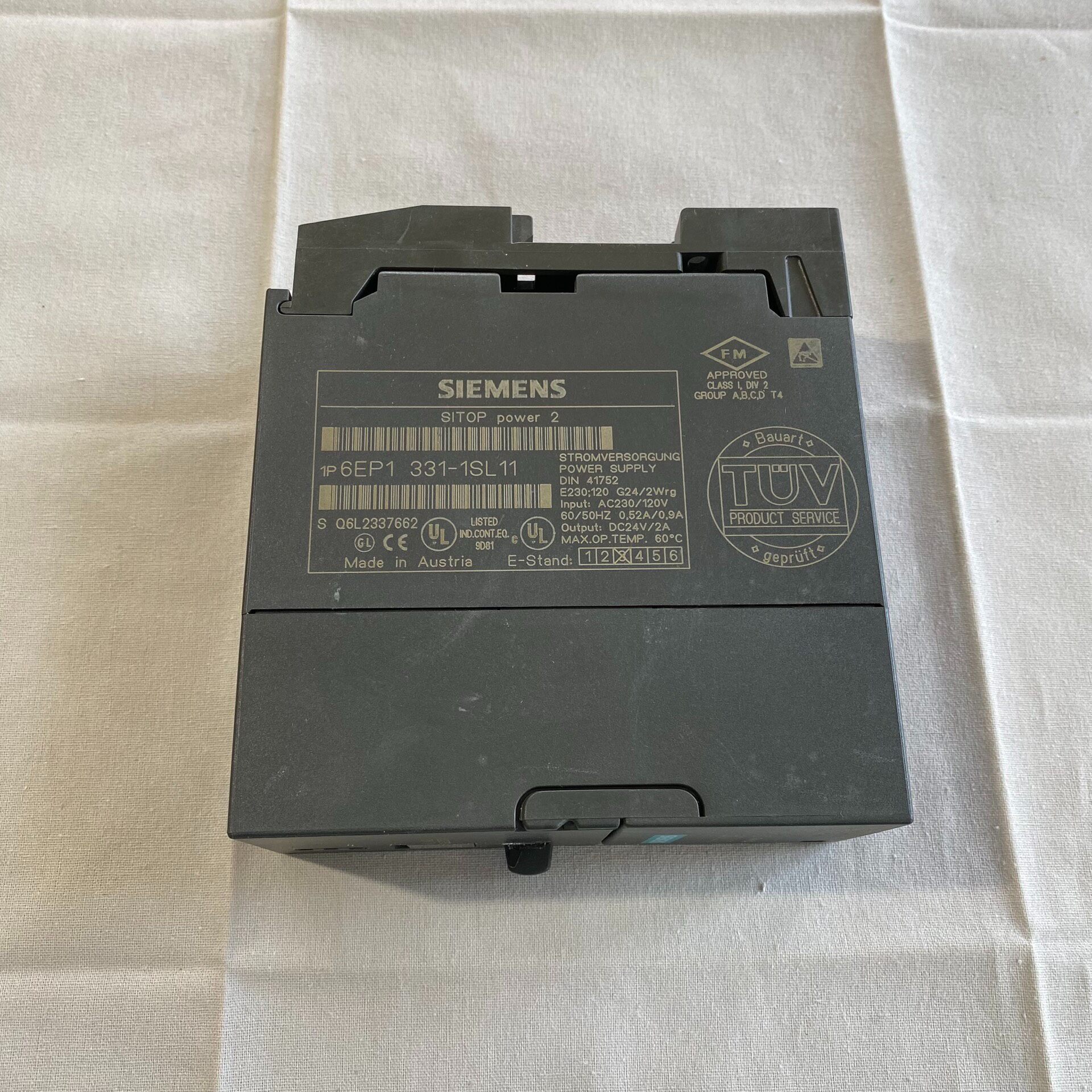 产品包装内含1台电源模块,包装标签信息包括型号6EP1331-1SL11、数量1、产地奥地利等,标签上有清晰的条形码和序列号(S 06L237662),可用于产品追溯。