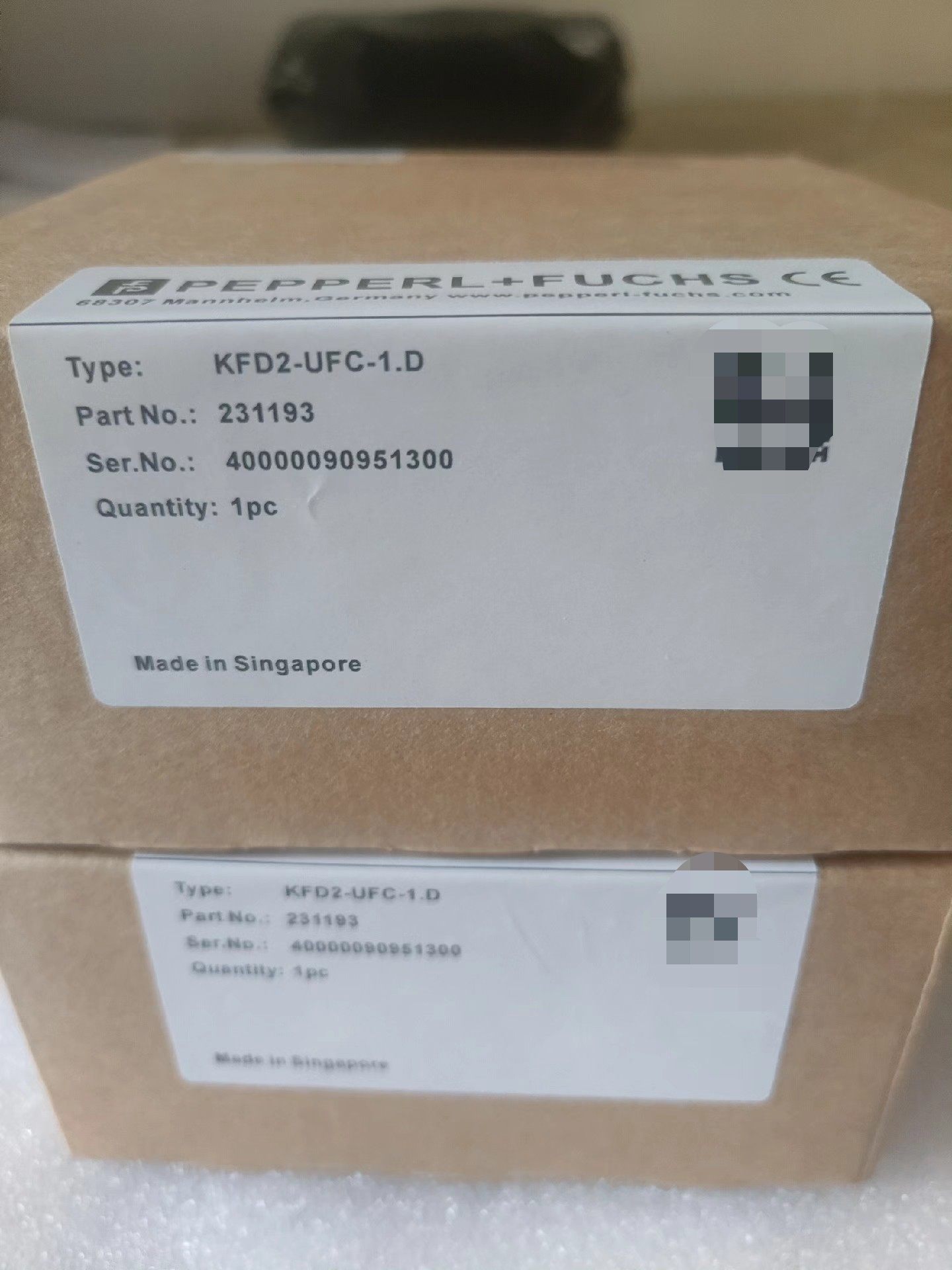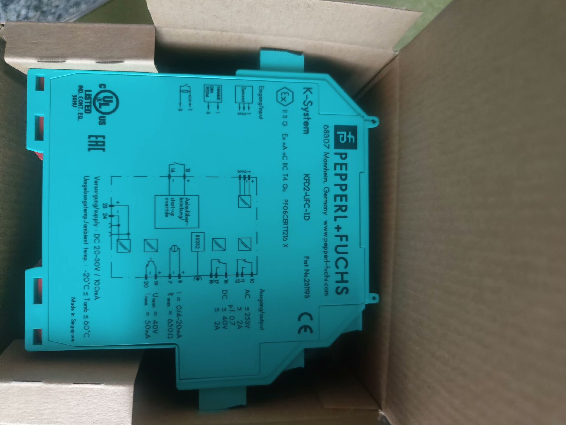 产品采用原厂牛皮纸包装,外包装贴有品牌标识、型号、产地(Made in Singapore)及官方网址(www.pepperl-fuchs.com),内含安全栅主体及相关文档(如有)。