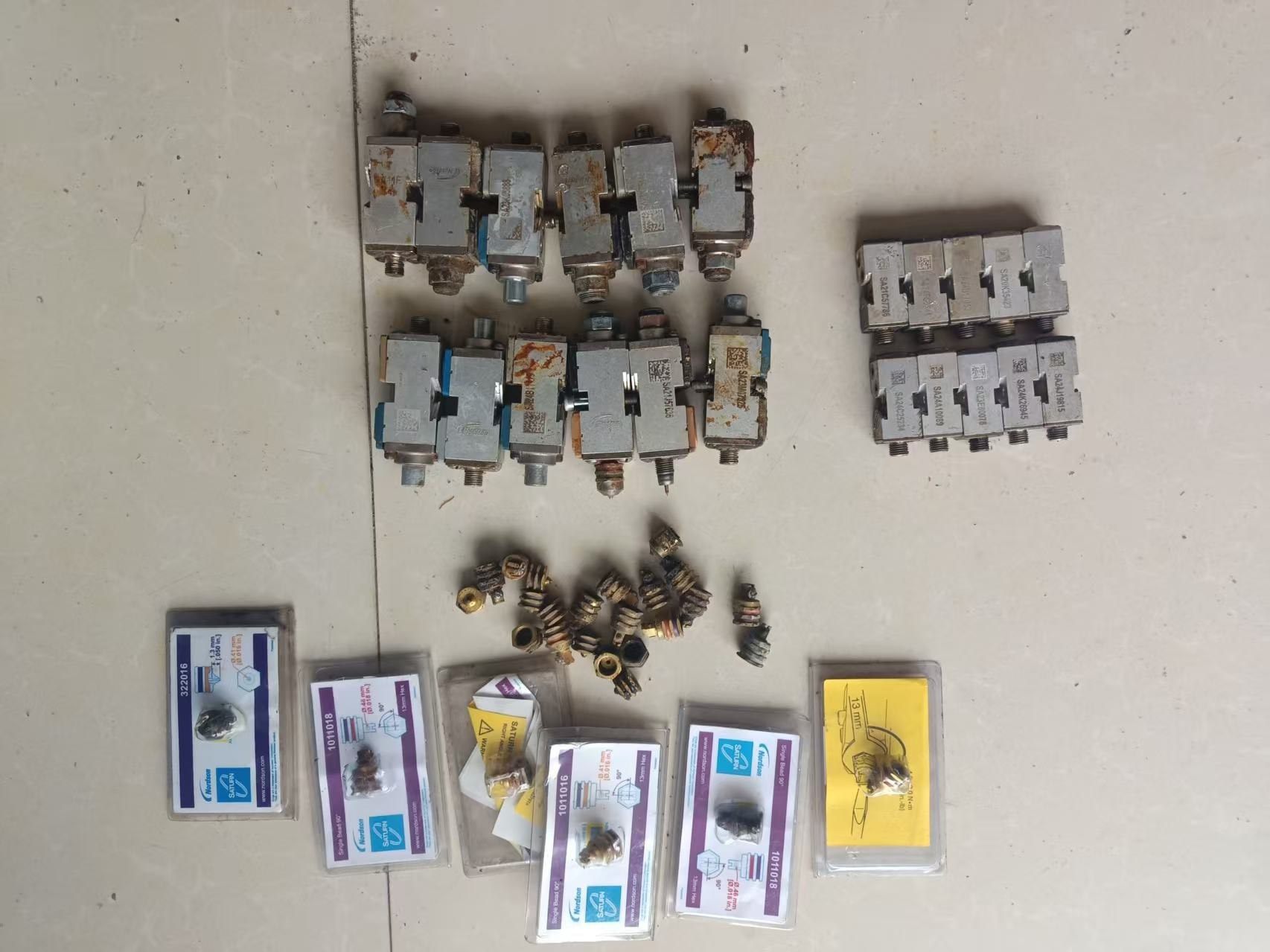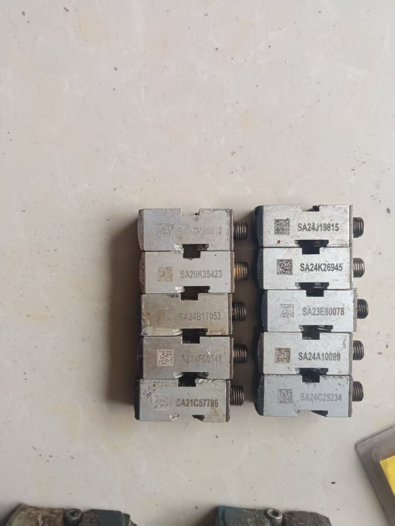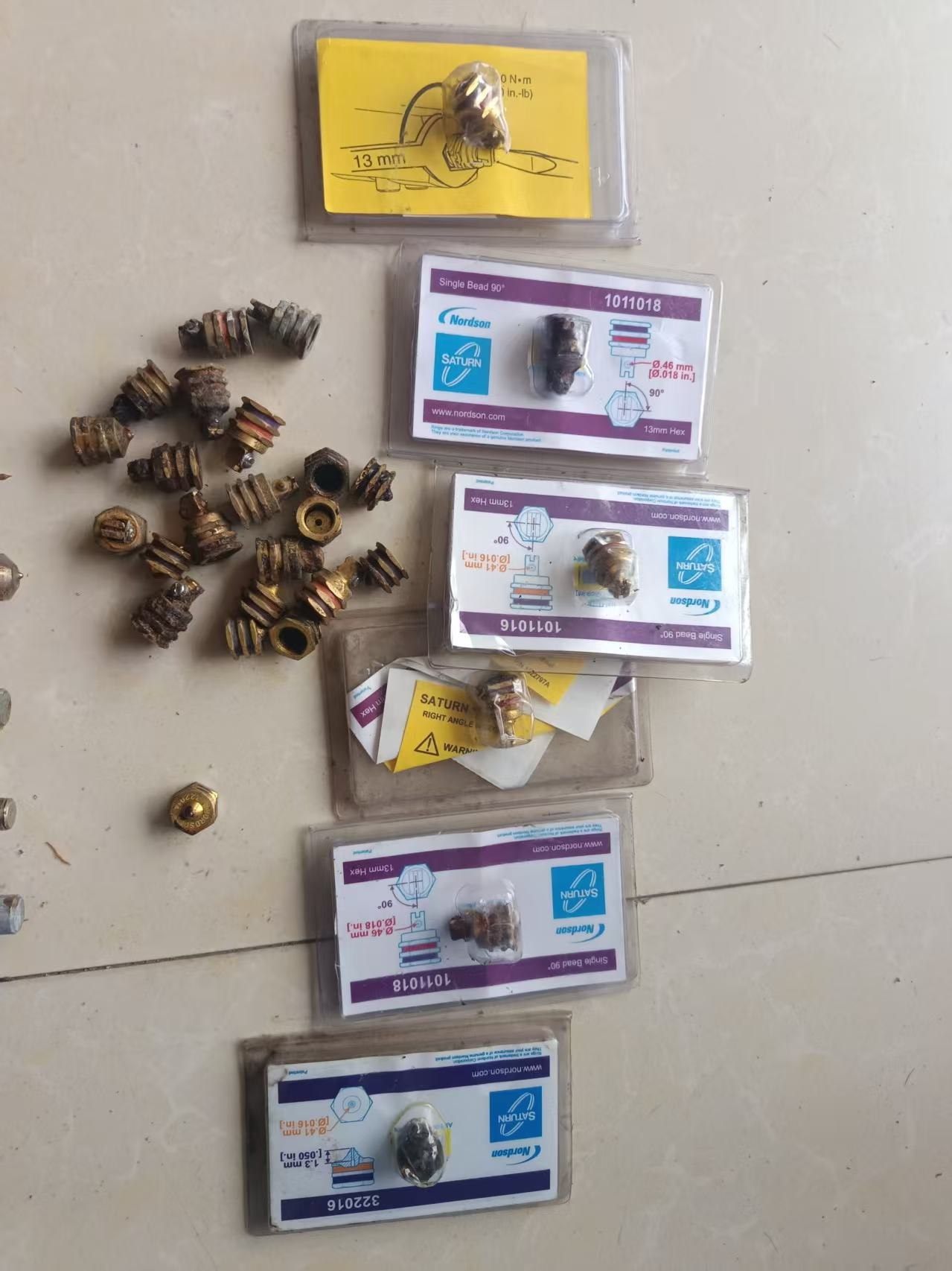 本批产品为诺信(Nordson)品牌喷胶阀,包含型号SA23M07802、SA21J57635、SA23K06088等,均为工业级气动液压控制元件。产品采用金属材质制造,表面存在自然锈迹和使用痕迹,部分阀体带有二维码标签及型号标识,整体结构完整,适用于各类自动化喷胶设备的胶水喷射控制。