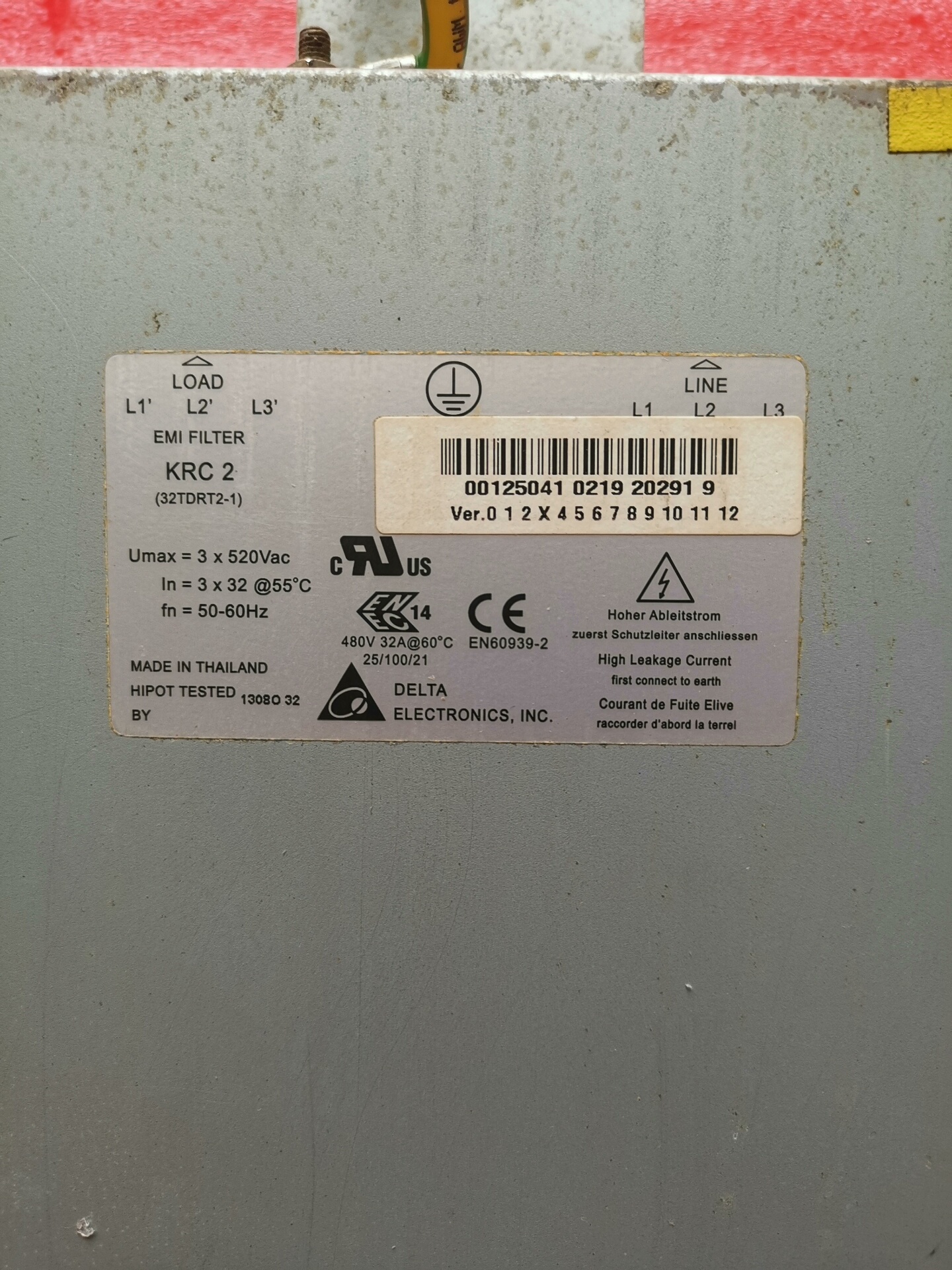 本产品为台达(DELTA)原装滤波器,型号32TDRT2-1,同时作为库卡(KUKA)KRC2机器人控制系统的专用配件,部件号00-125-401(00125401)。设备为拆机实物,外壳呈灰色金属材质,表面有轻微使用痕迹,顶部及侧面引出多股连接线,含黄绿双色地线,整体结构坚固,适用于工业自动化环境下的电源滤波。