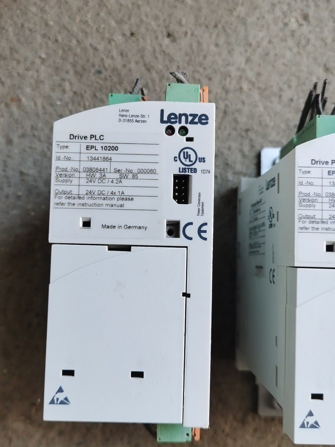 本产品为Lenze品牌的EPL 10200型号Drive PLC,原装拆机,功能包好,实物图拍摄。设备采用白色外壳设计,配备绿色和橙色接线端子,整体结构紧凑,适用于工业自动化控制场景。