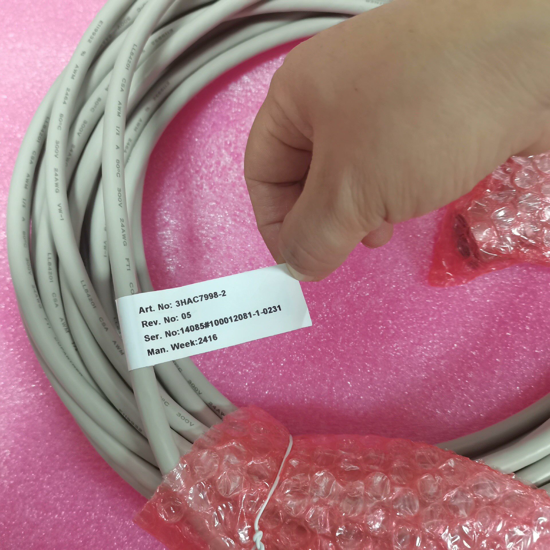 本产品为ABB机器人专用编码器线,型号3HAC7998-2,采用优质材料制成,具备良好的信号传输性能和耐用性。白色多股线缆设计,柔韧性强,适合机器人运动过程中的反复弯曲,确保信号稳定传输。