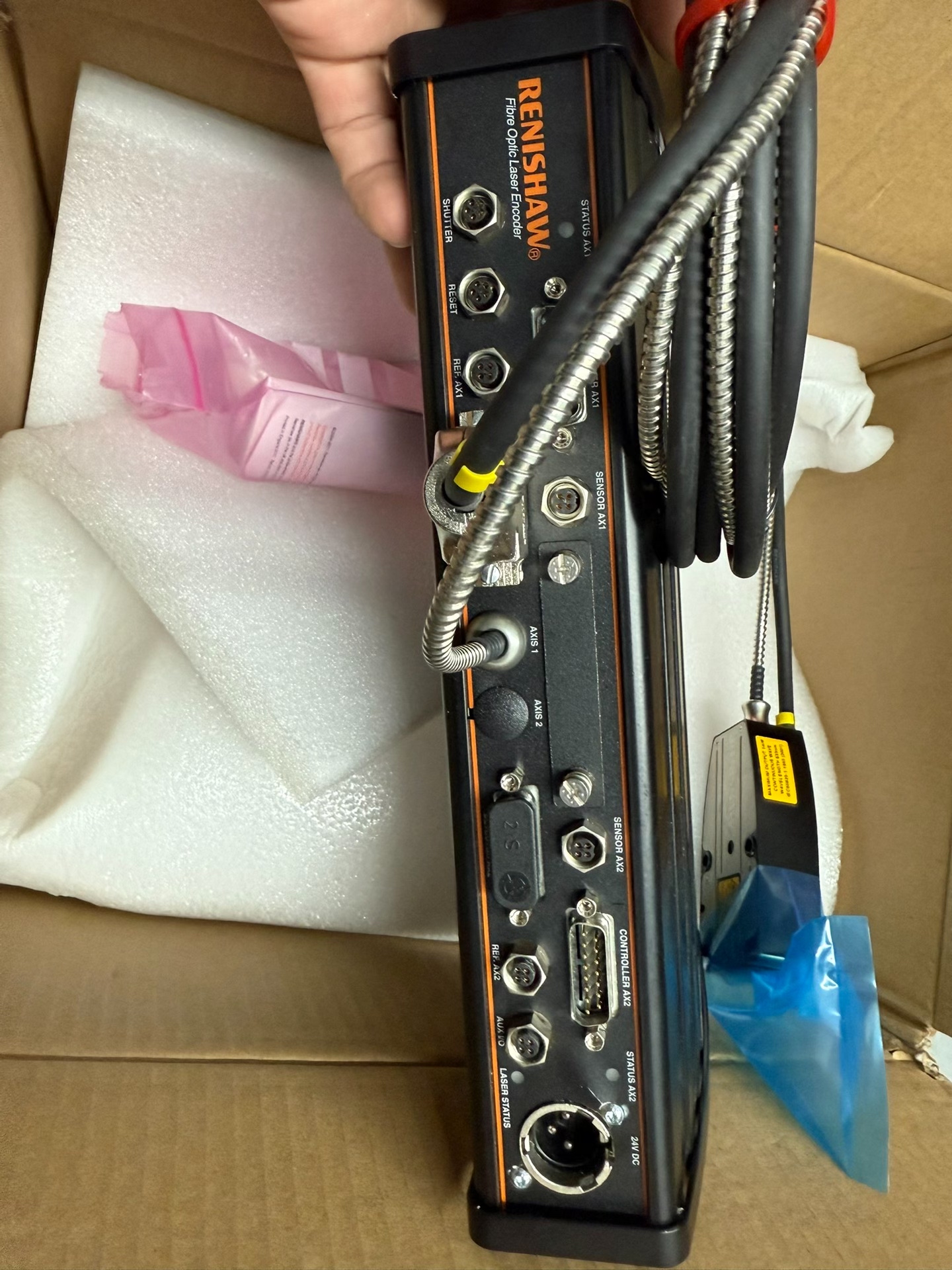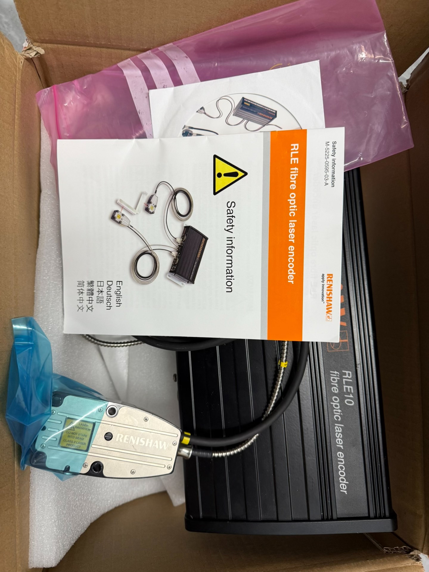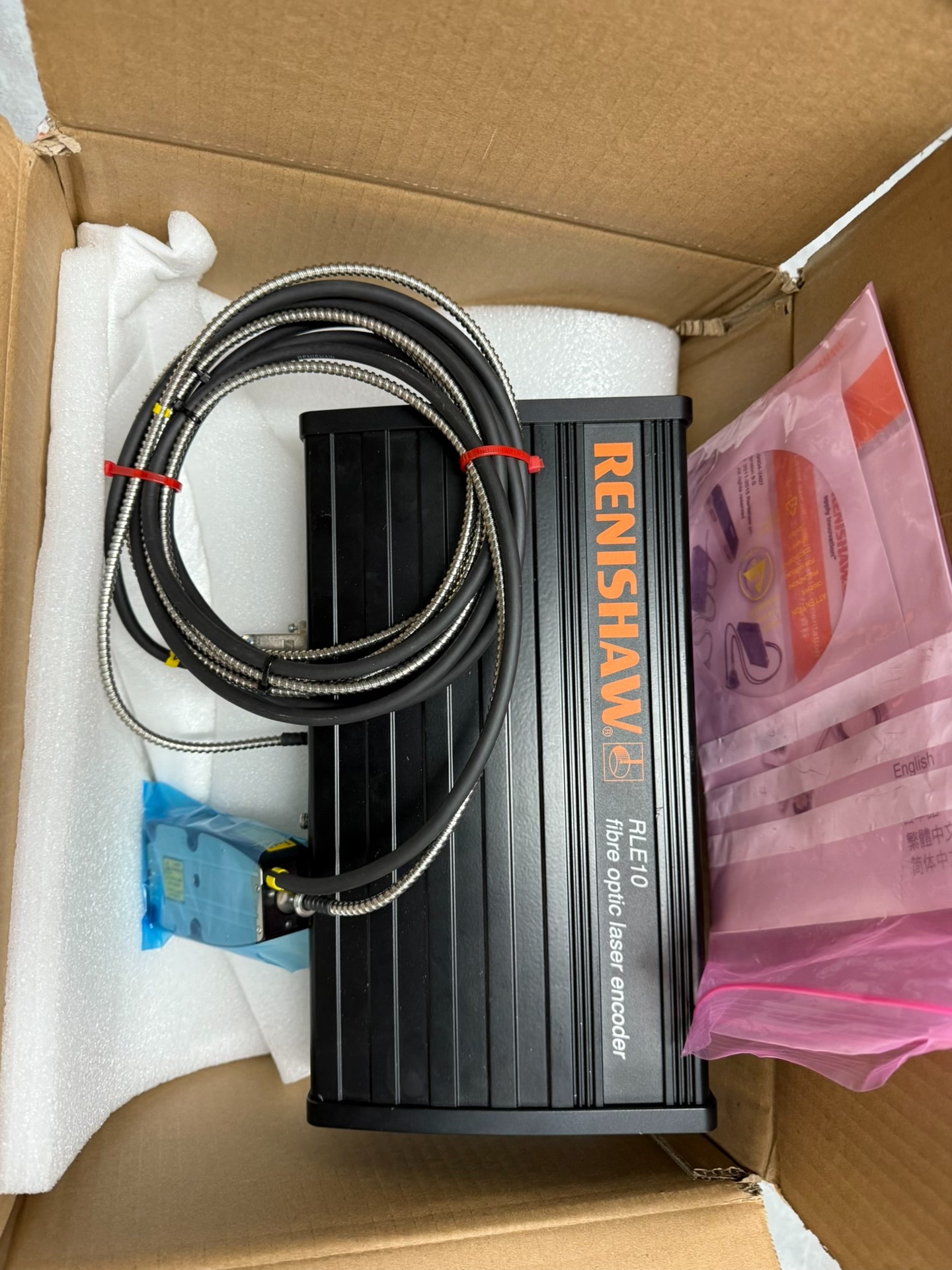 雷尼绍RLE10光纤激光编码器是一款高精度工业测量设备,采用先进的光纤激光编码技术,专为精密机械运动控制与位置反馈设计。产品主体为黑色金属结构,表面印有橙色RENISHAW品牌标识,配备耐用的金属波纹管连接线束,附带多语言(含英文、日文、简体中文)安全说明书。