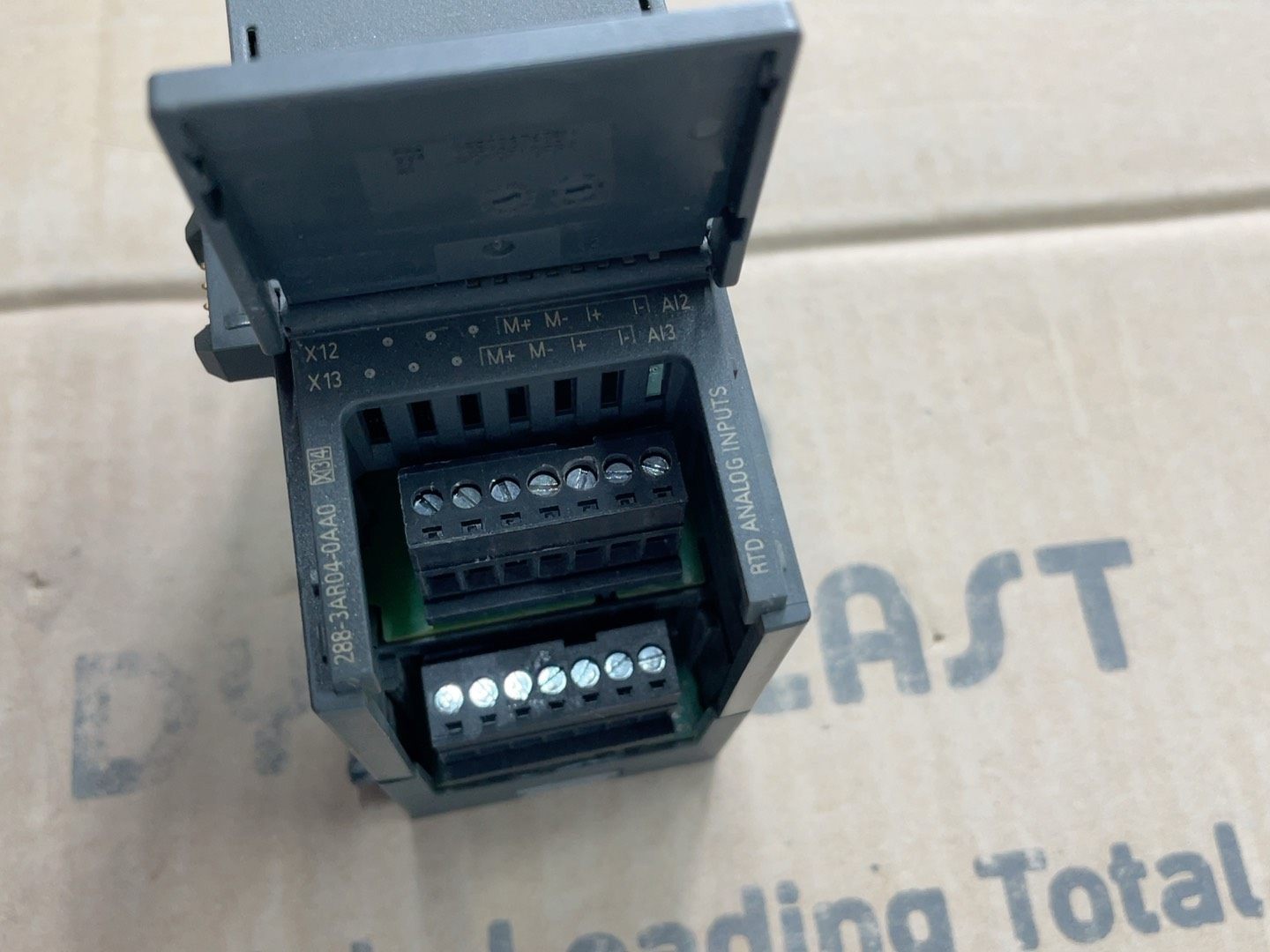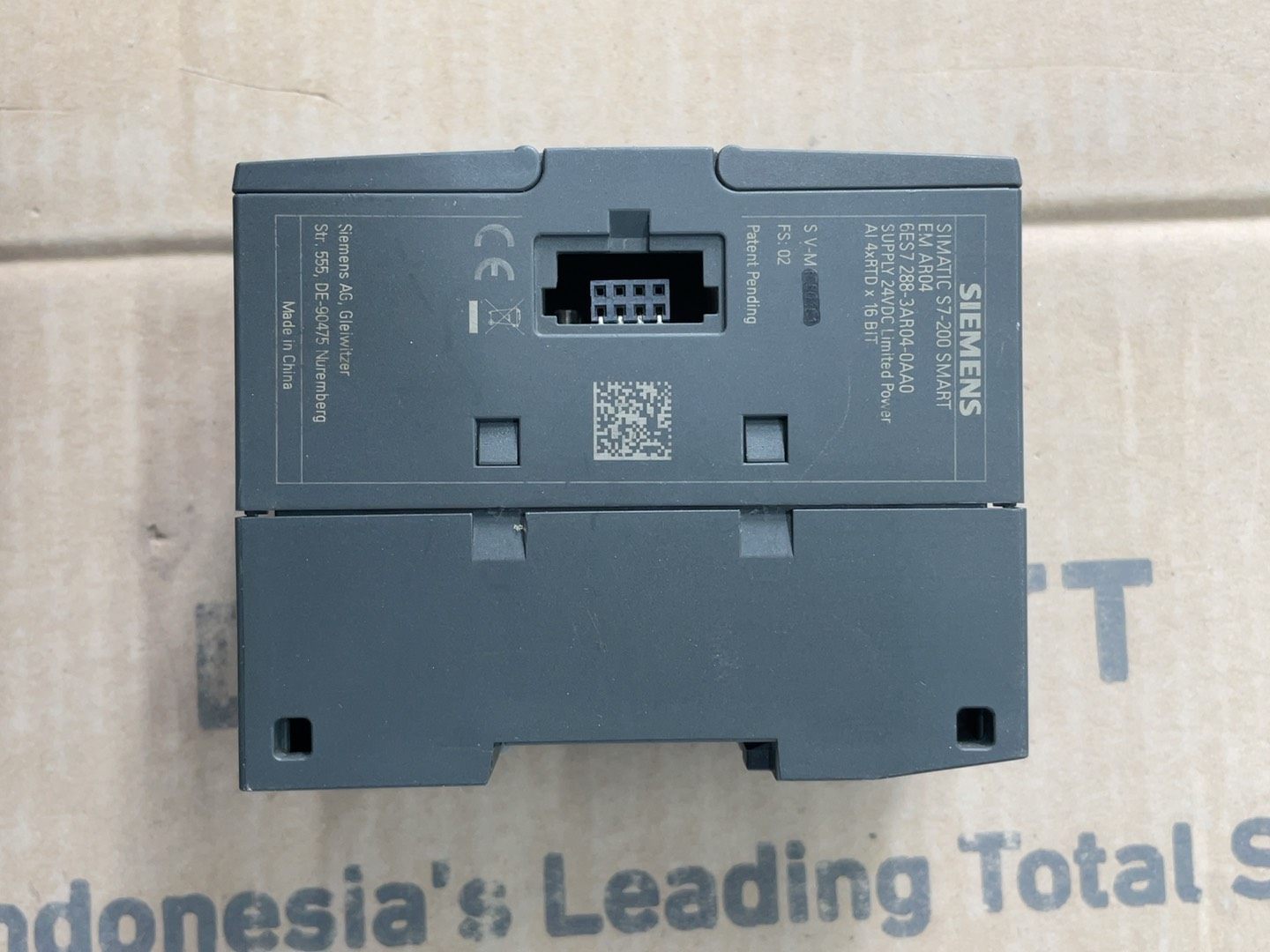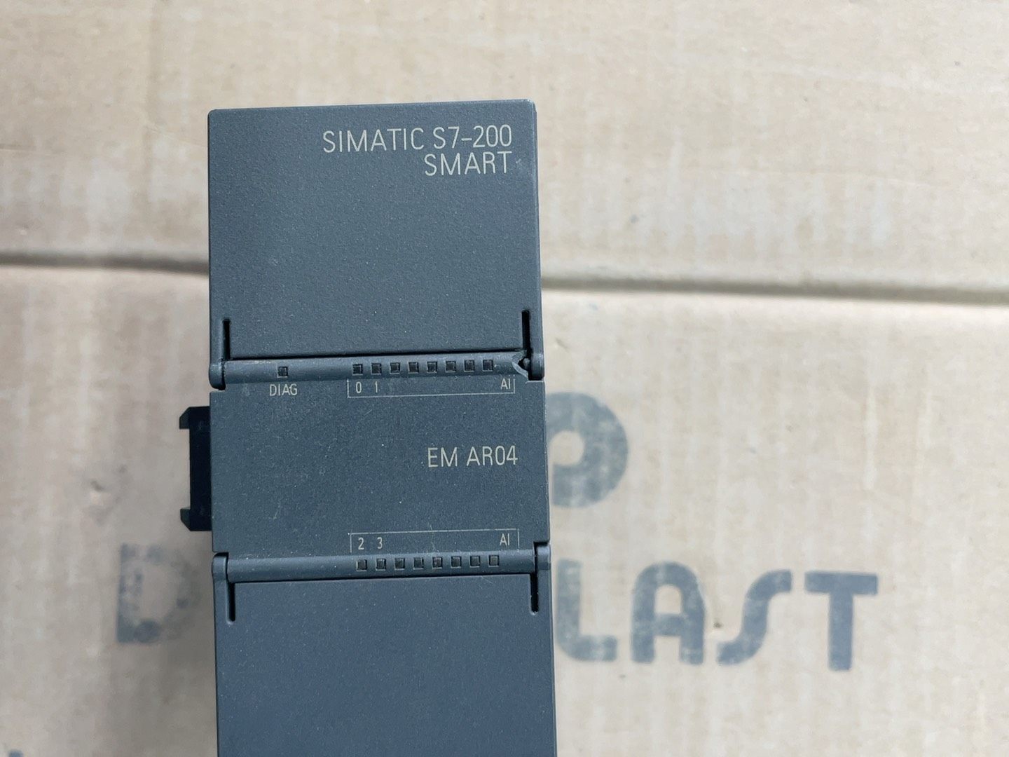模块整体为深灰色工业外壳,表面印有“SIMATIC S7-200 SMART”及“EM AR04”标识。上壳挂角处存在裂纹,成色一般,但不影响内部功能及安装使用,发货时将以实物图为准。