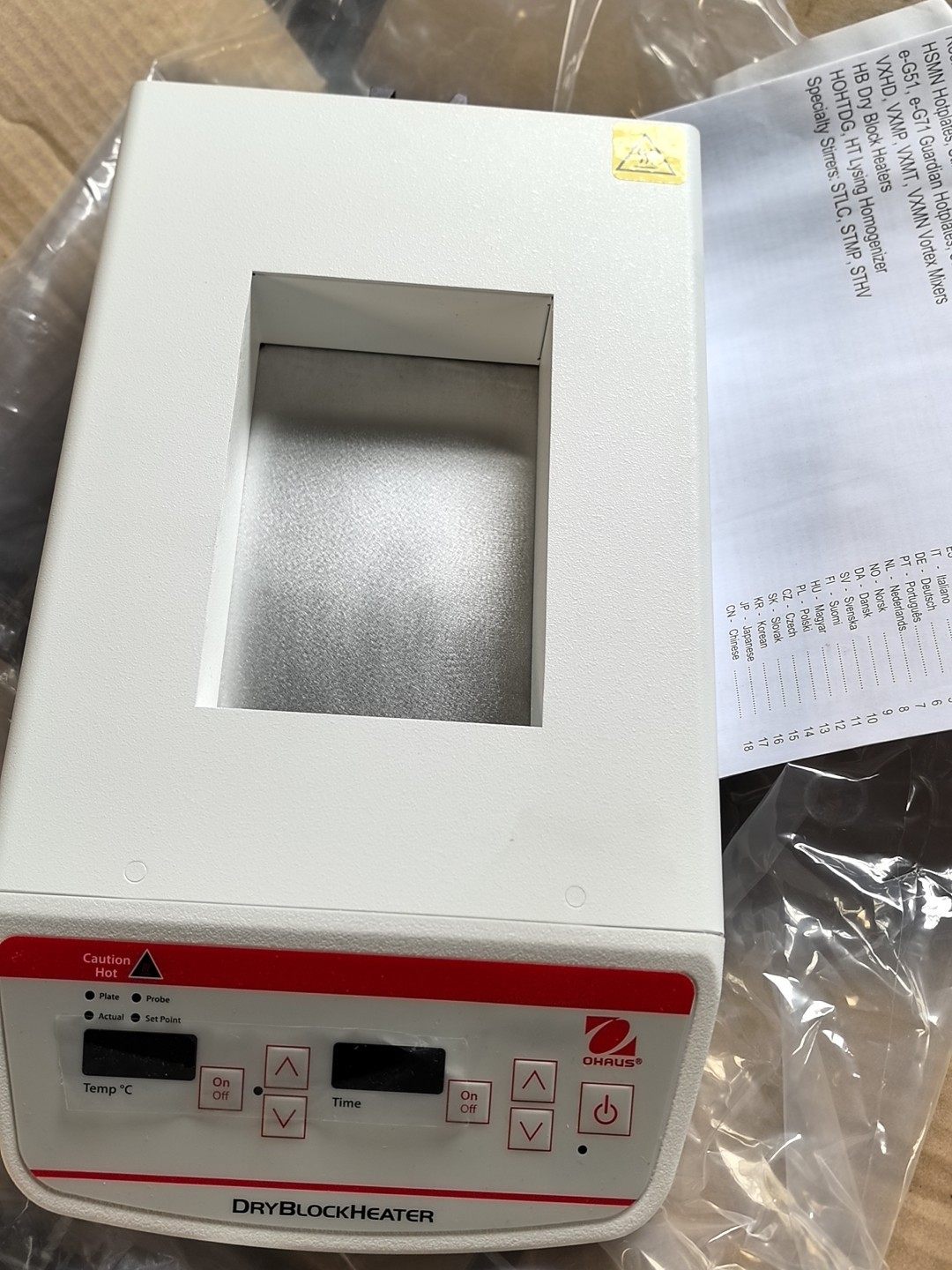 美国OHAUS奥豪斯HB系列恒温干式金属浴是一款专为实验室样品加热设计的精密温控设备,采用先进的温度控制技术,结合直观的数显操作界面,为科研、医疗、化工等领域的样品恒温处理提供稳定可靠的解决方案。设备外观为白色外壳,正面配备红色控制区域,集成温度与时间双显示功能,操作便捷,安全性能突出。
